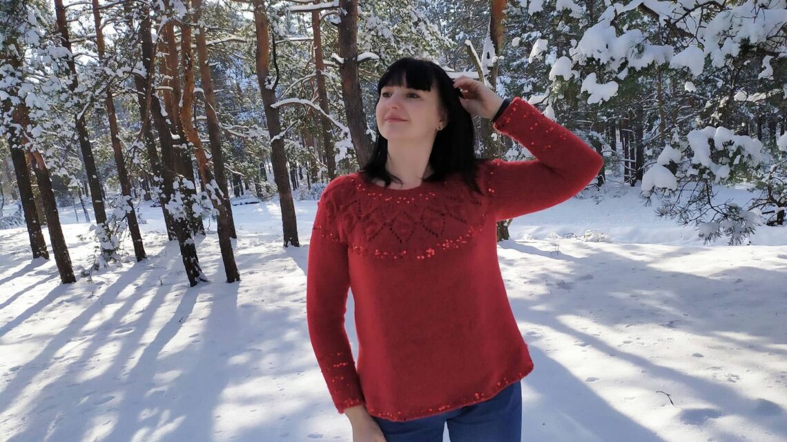 На кокетке будут простые, незамысловатые узоры, а пряжа с пайетками придаст легкий блеск и нежное мерцание.