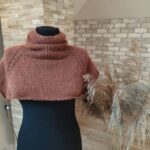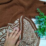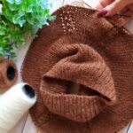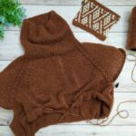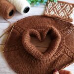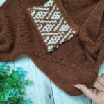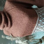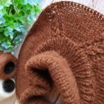 Кокетку выполняю лицевой гладью, лини реглана – рельефные жгутики (схема в галерее ниже). Высота кокетки 20 см. Далее на петлях спинки и двух линий реглана вяжем “азиатский росток” поворотными рядами. Затем добираем петли для подрезов (у меня по 10 петель) с каждой стороны. И переходим на круговое вязание основной части.