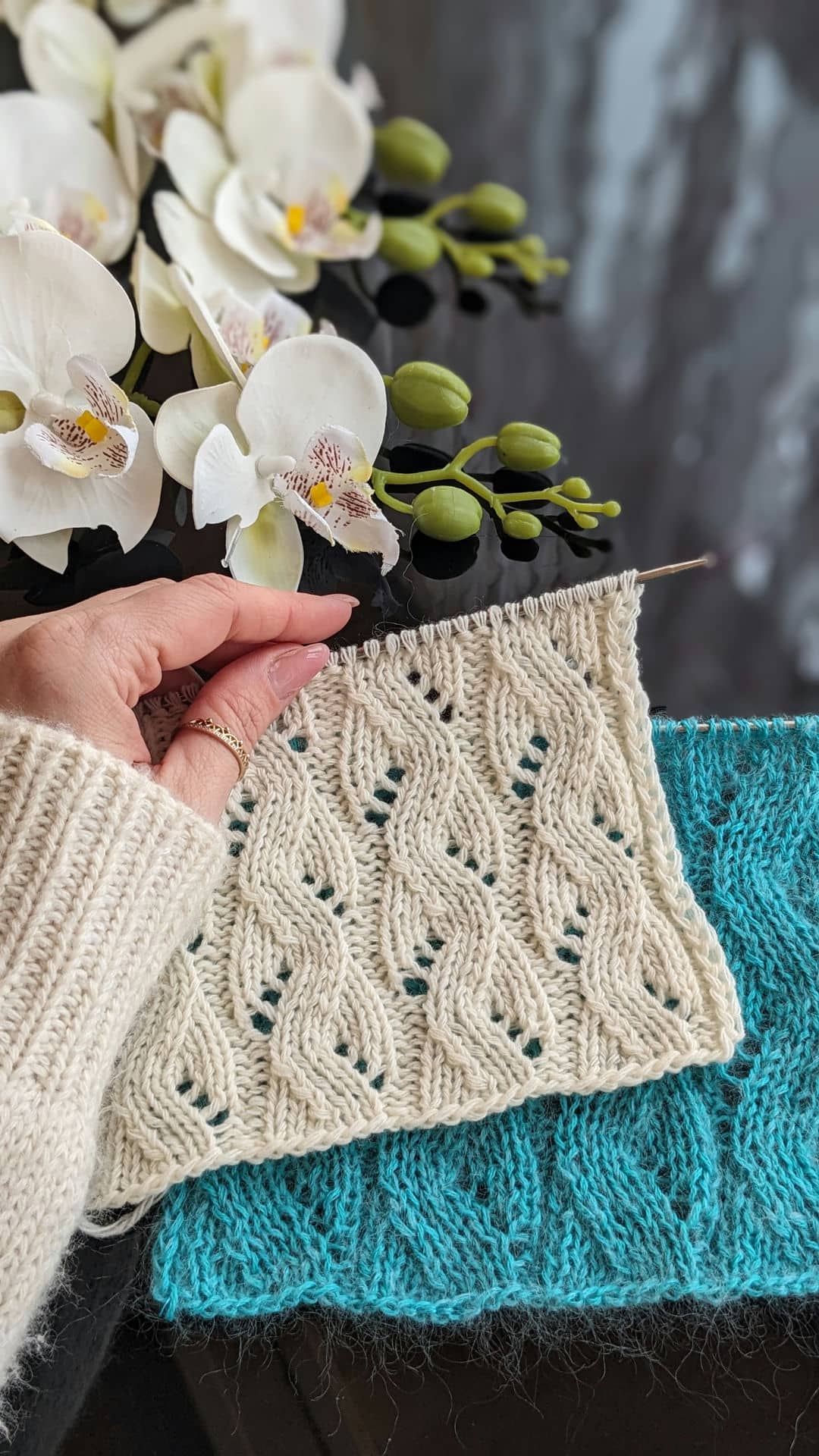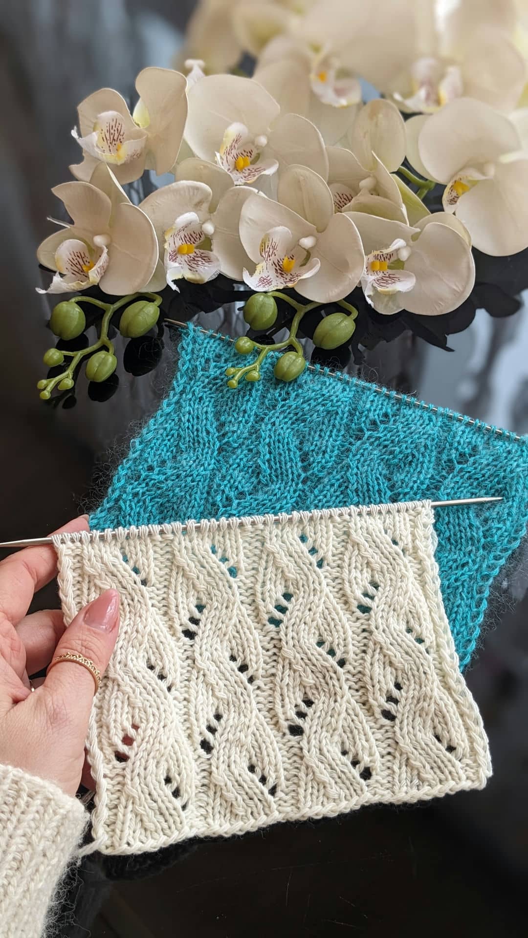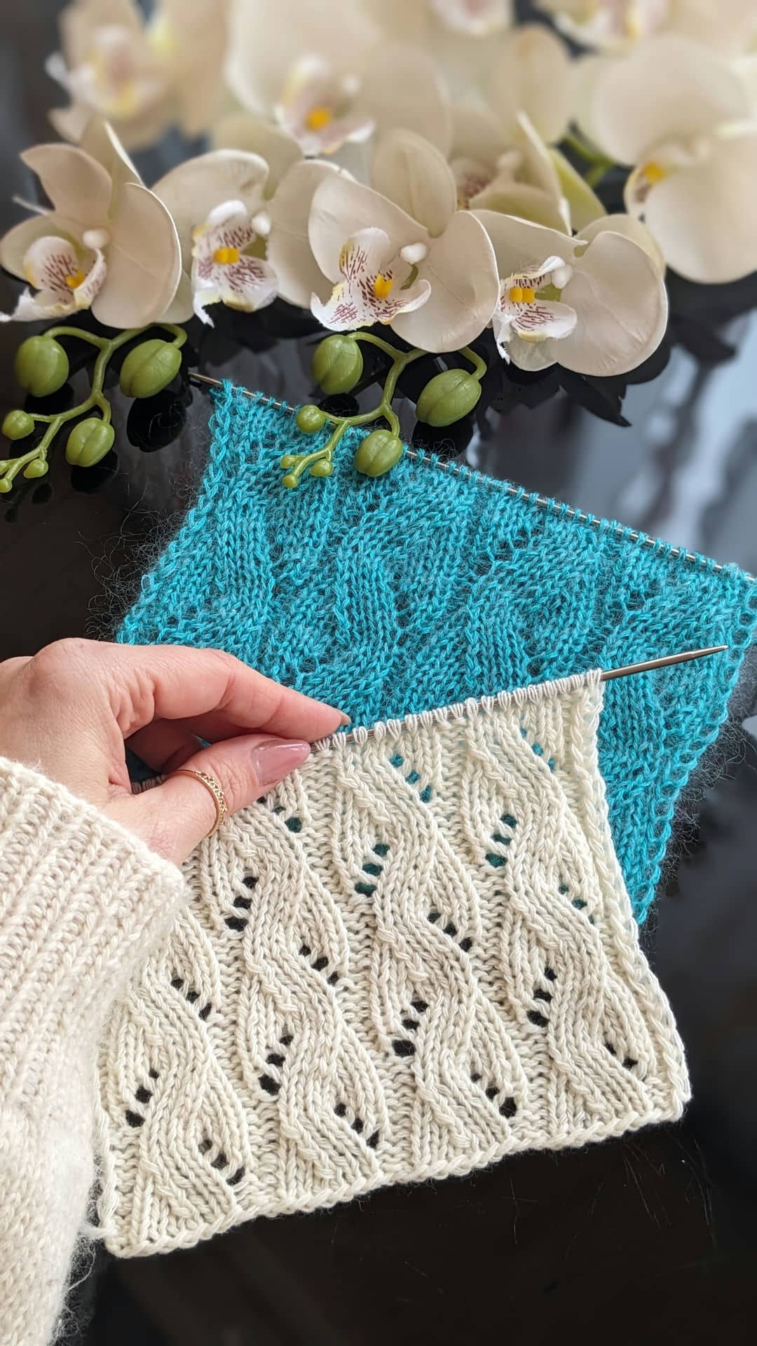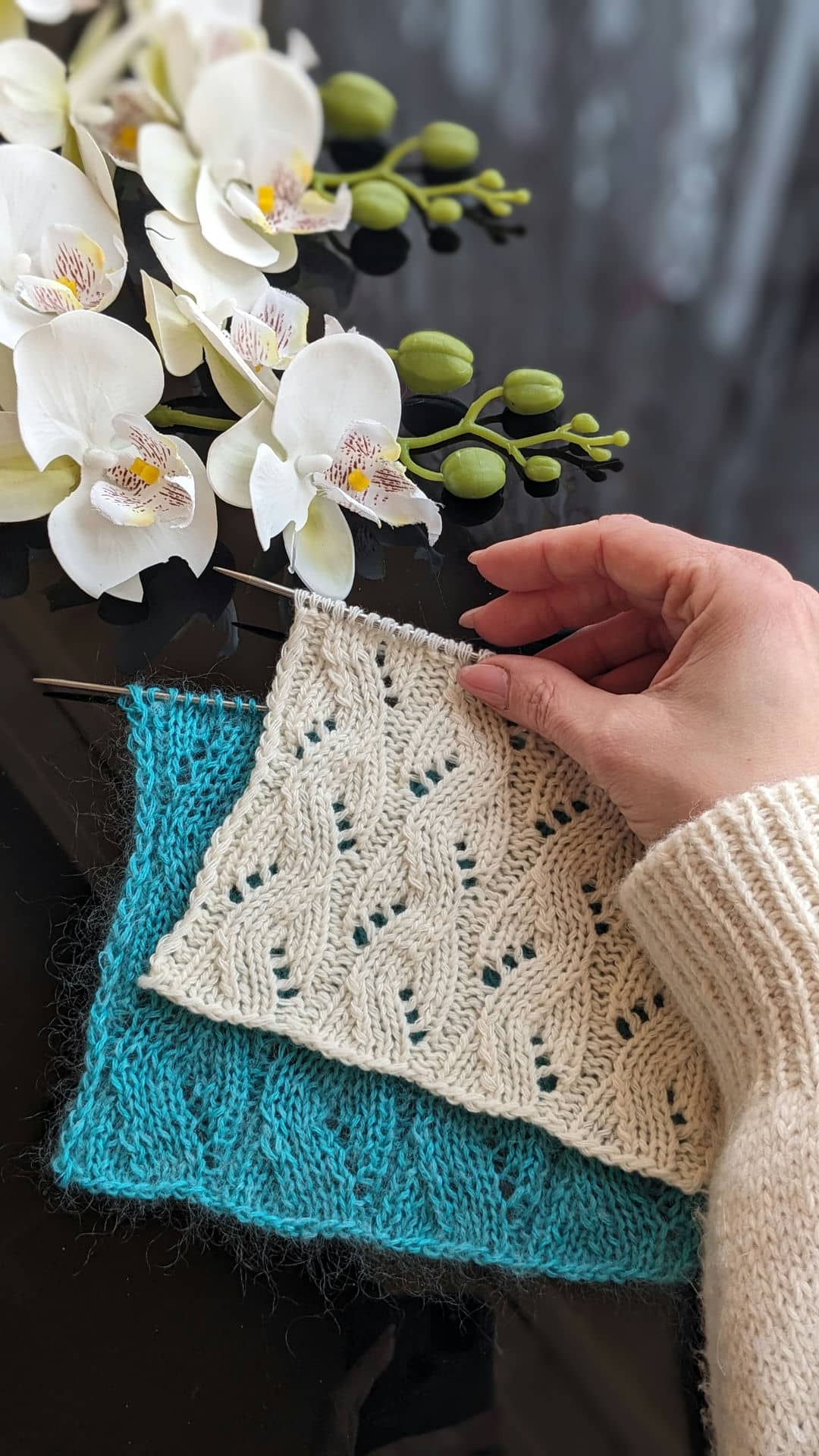 Головна перевага ажурних доріжок — їхня гнучкість. Ширину доріжки можна легко змінювати, коригуючи схему візерунка: 8, 10 або 12 петель у рапорті дозволяють адаптувати полотно під різні моделі — від лаконічних топів до більш об’ємних джемперів.