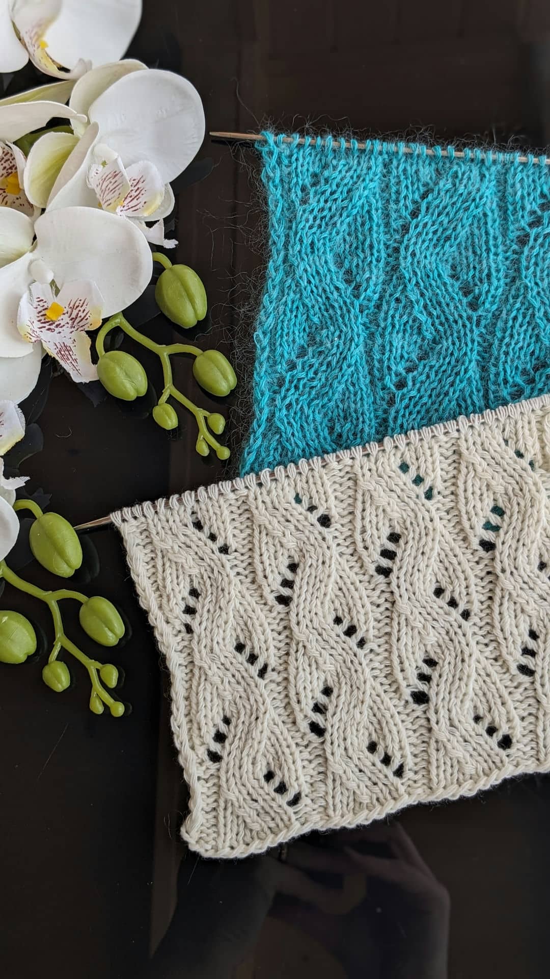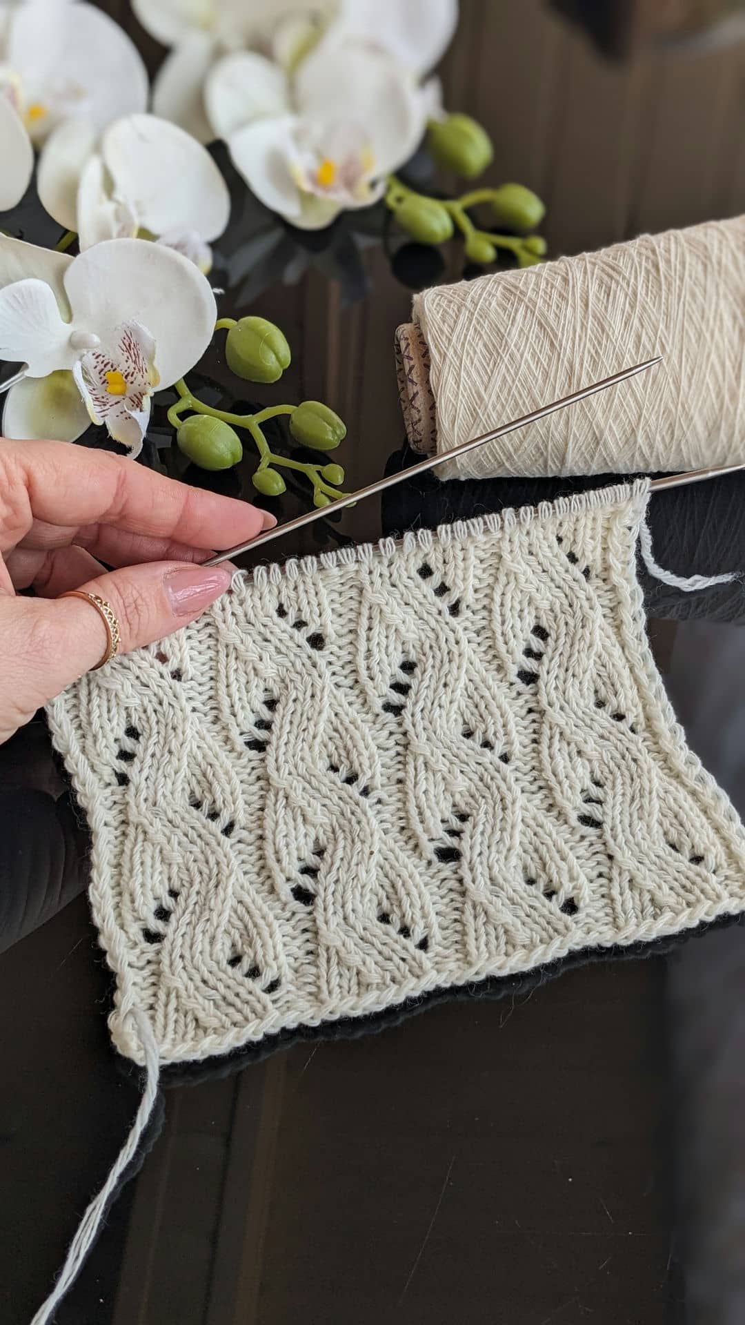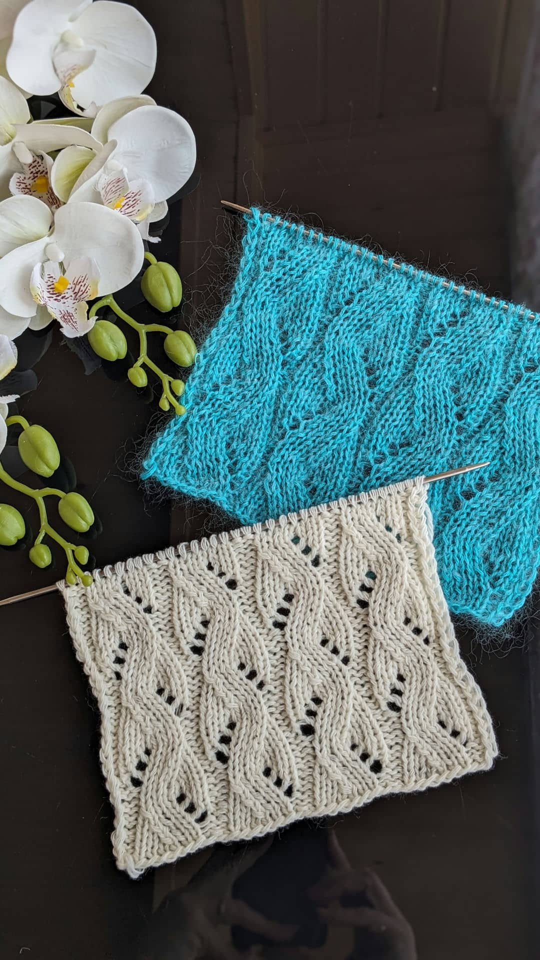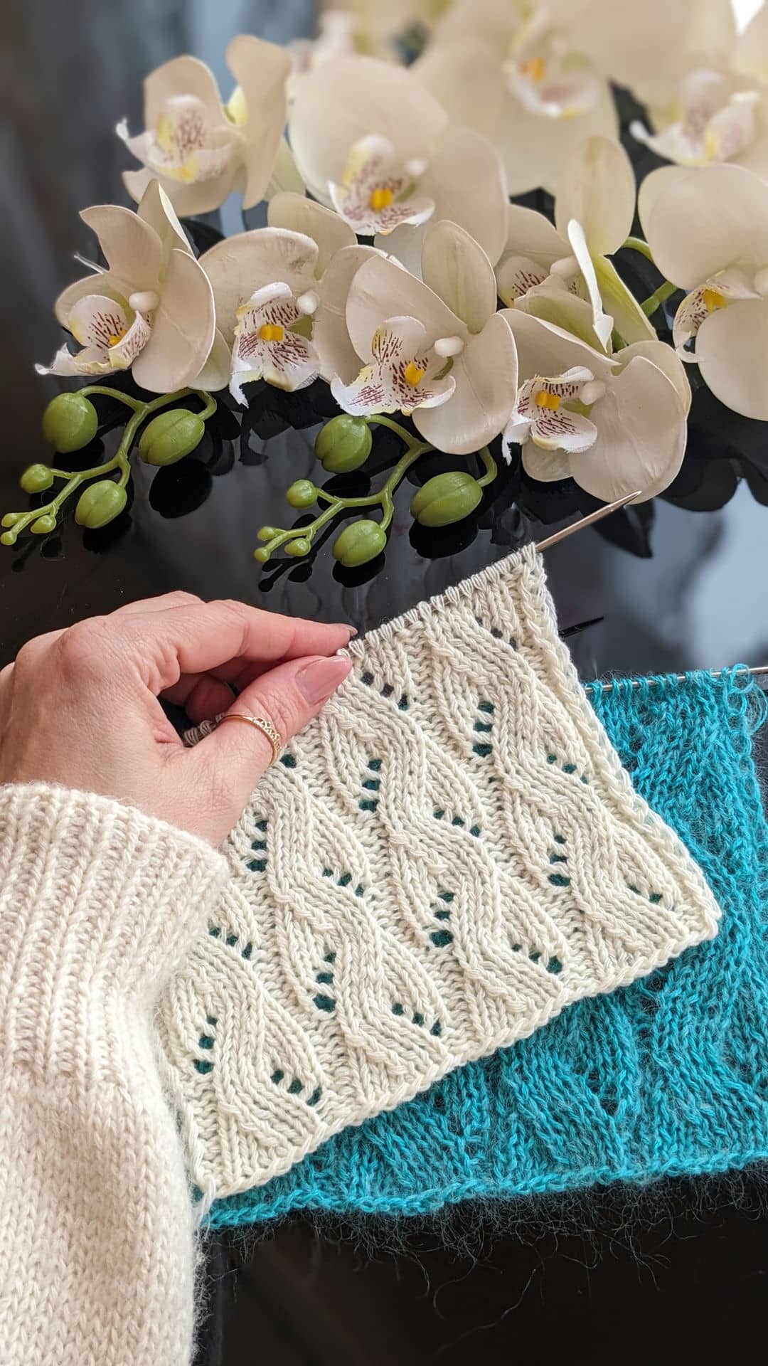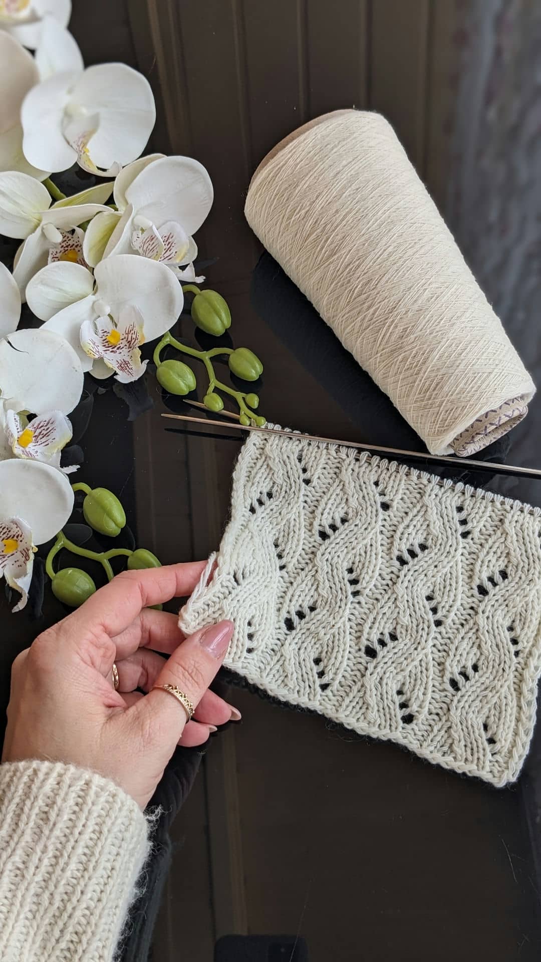 Головна перевага ажурних доріжок — їхня гнучкість. Ширину доріжки можна легко змінювати, коригуючи схему візерунка: 8, 10 або 12 петель у рапорті дозволяють адаптувати полотно під різні моделі — від лаконічних топів до більш об’ємних джемперів.
