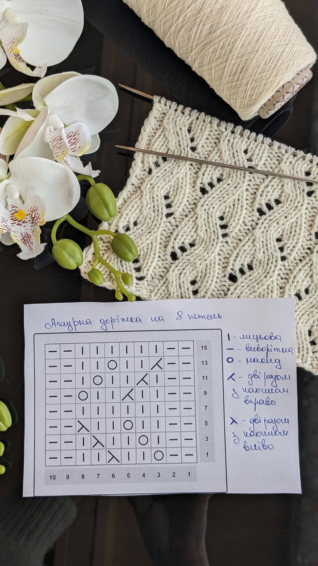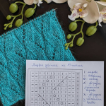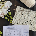 Рапорт візерунка 8 петель. При в’язанні зворотніми рядами додаємо 2 петлі для симетрії та 2 крайові петлі. Схему додала нижче в галерею.