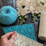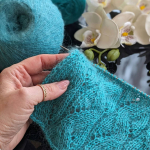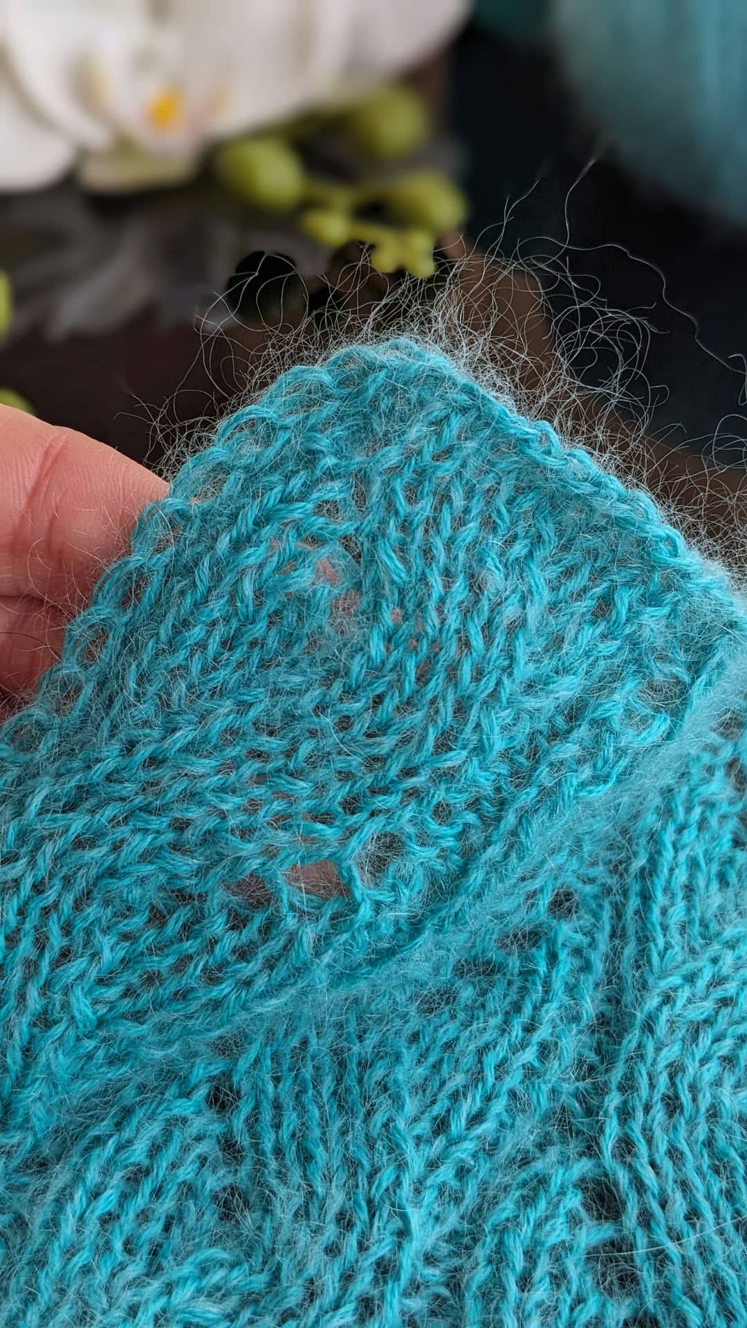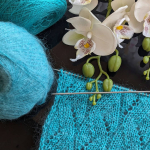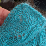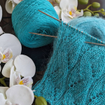 Блакитний зразок: поєднання кід мохеру (одна нитка, 1000м/100г) та мериносу (дві нитки, 1500м/100г) створюють повітряне, ніжне полотно з легкою димкою. Такий варіант ідеально підходить для весняних джемперів, кардиганів та напівпрозорих виробів.