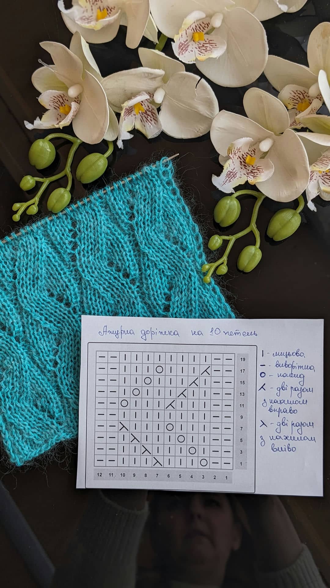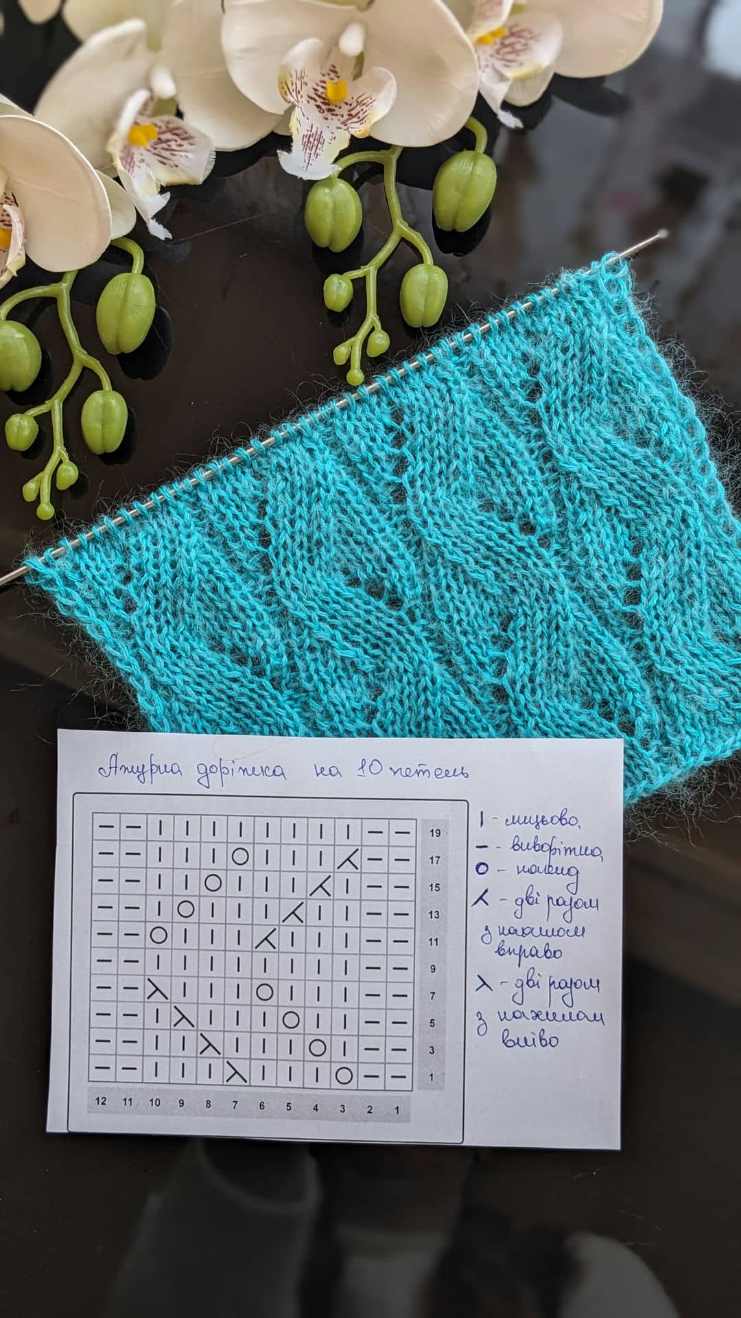 Рапорт візерунка 10 петель. При в’язанні зворотніми рядами додаємо 2 петлі для симетрії та 2 крайові петлі. Схему додала нижче в галерею.