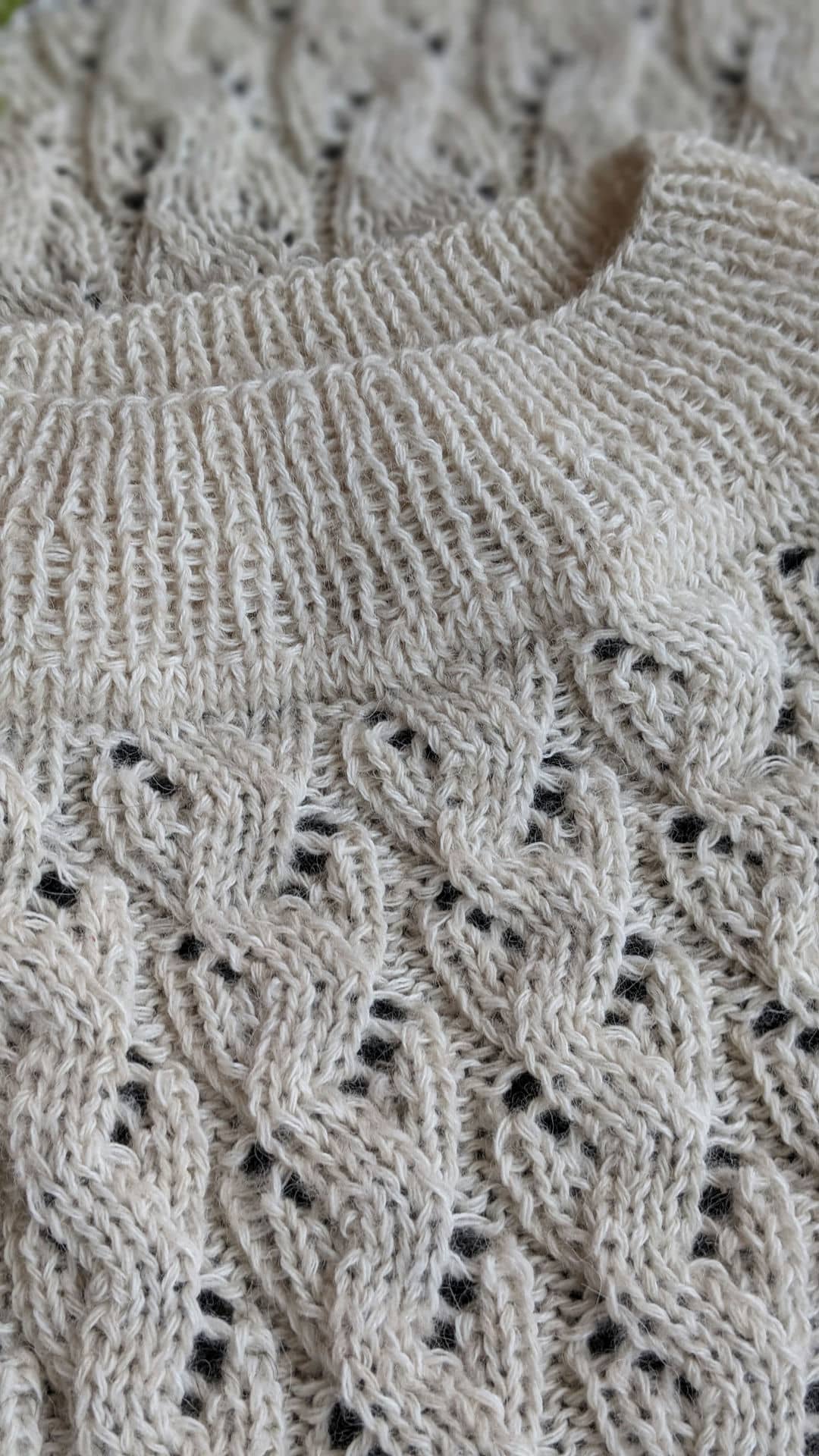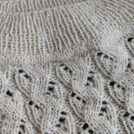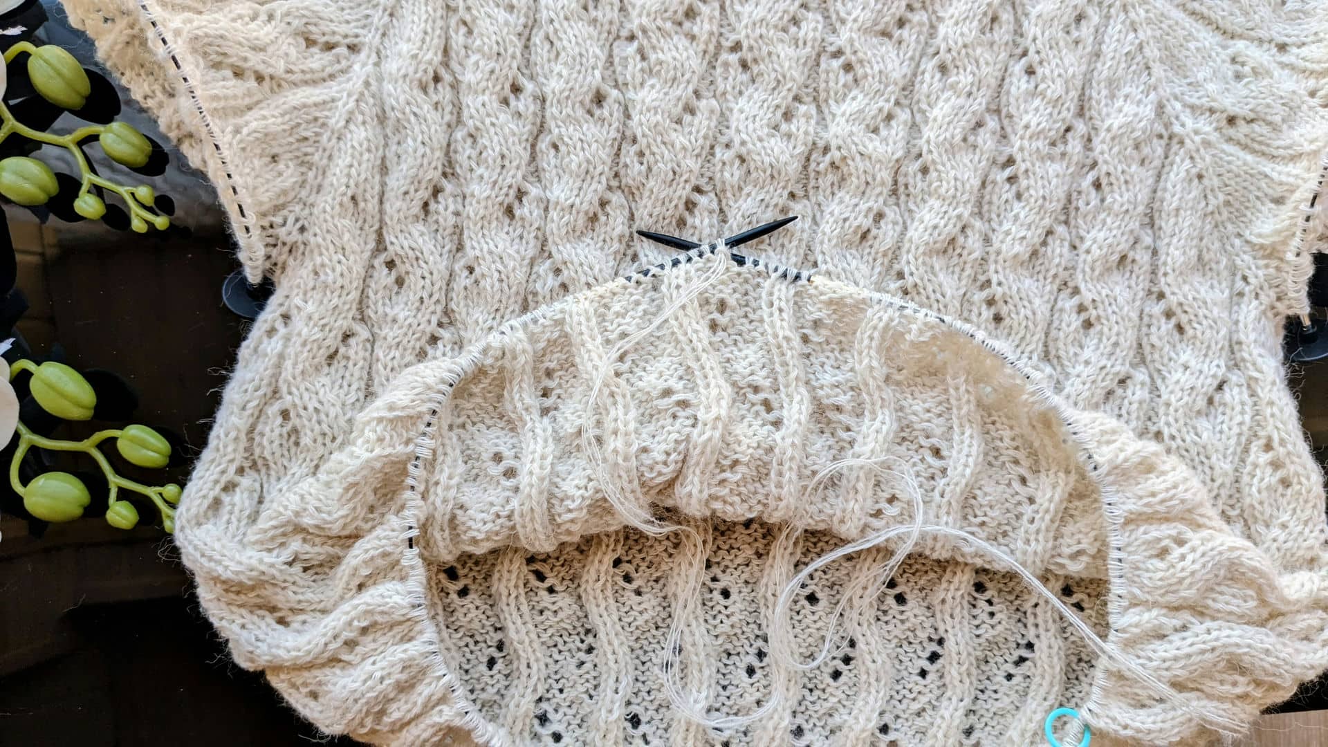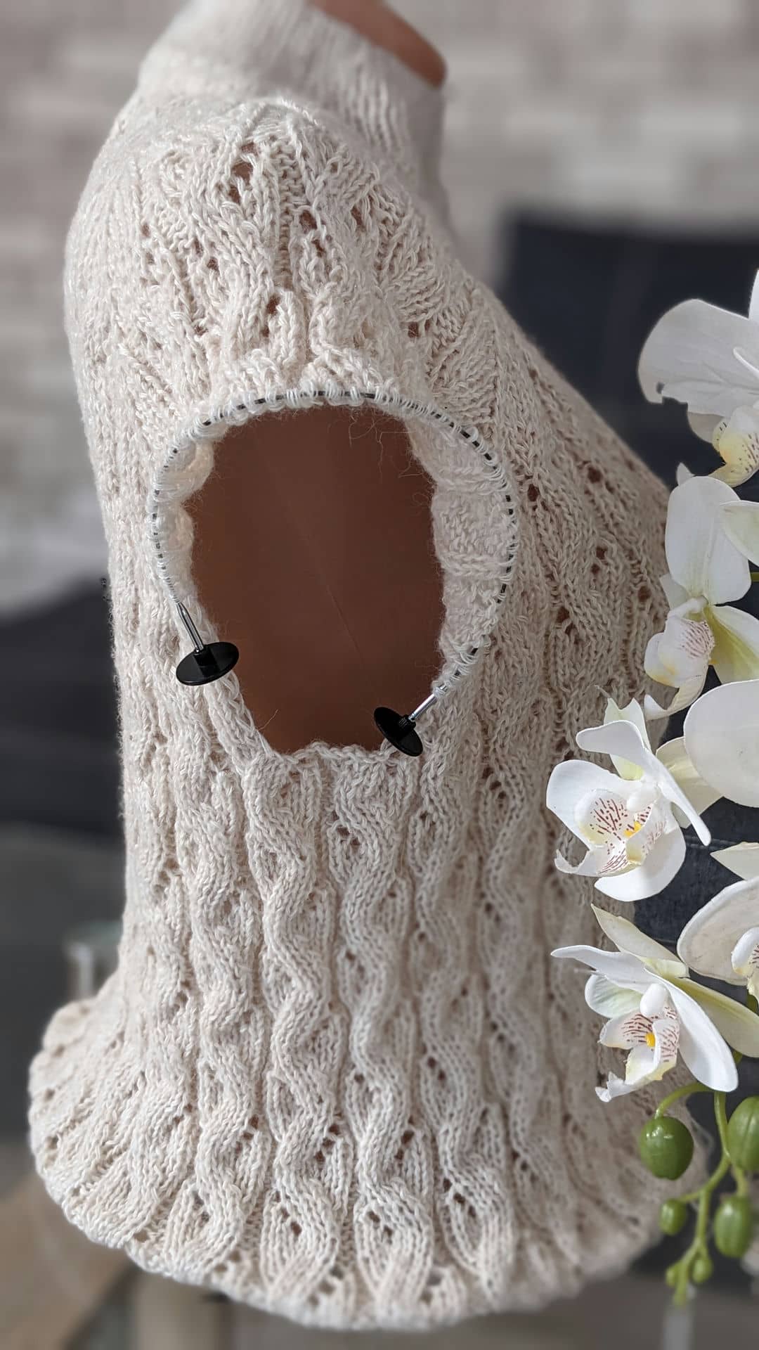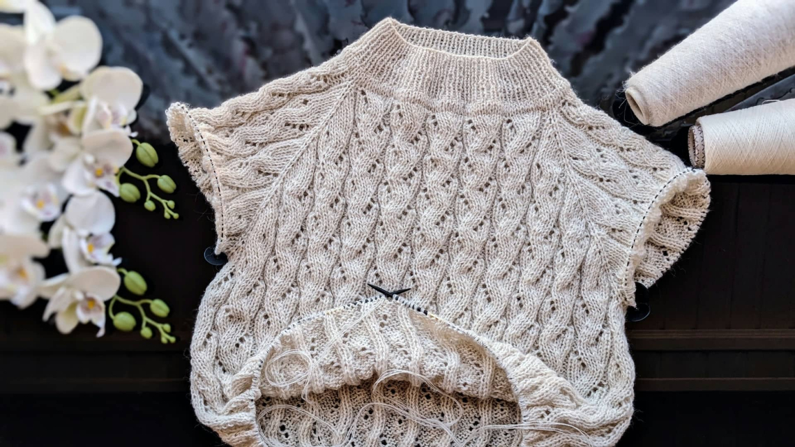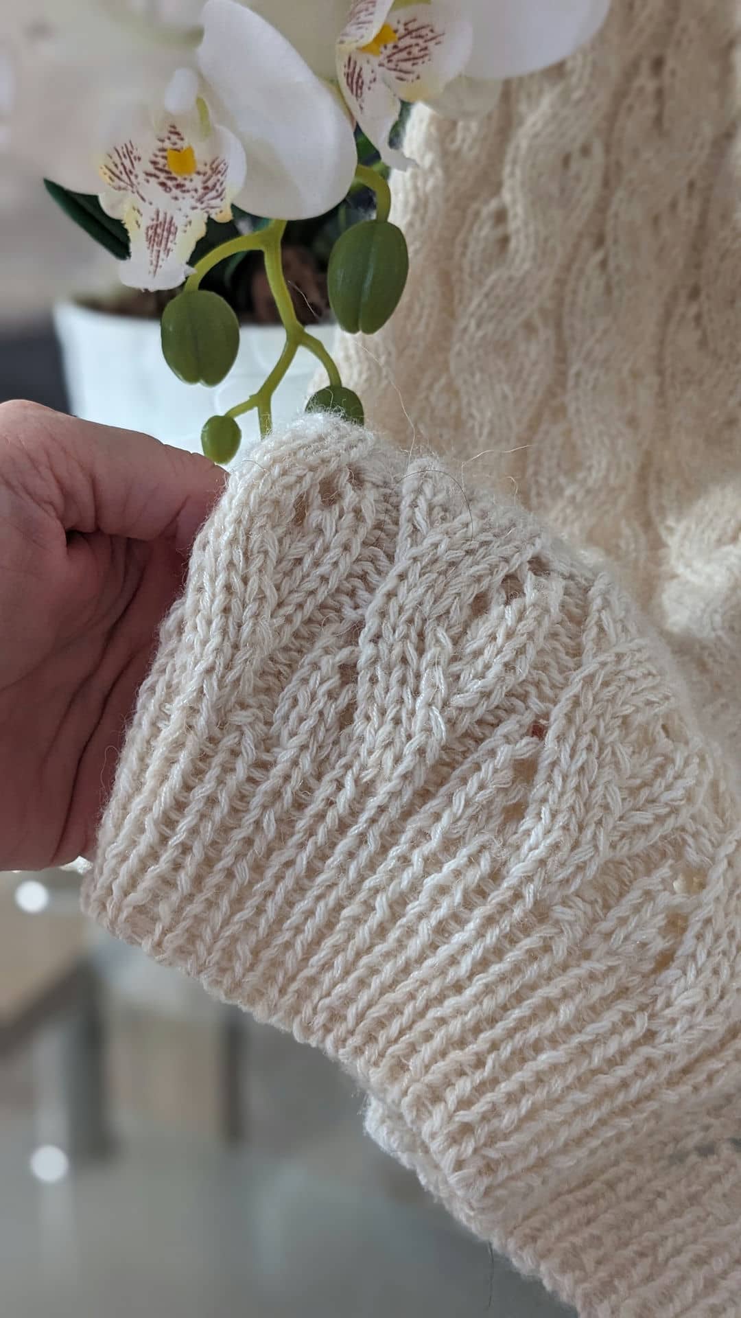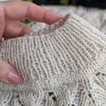 Горловина готова. Переходимо до основного полотна та ажурного візерунку. Розмір спиць міняємо на №4.