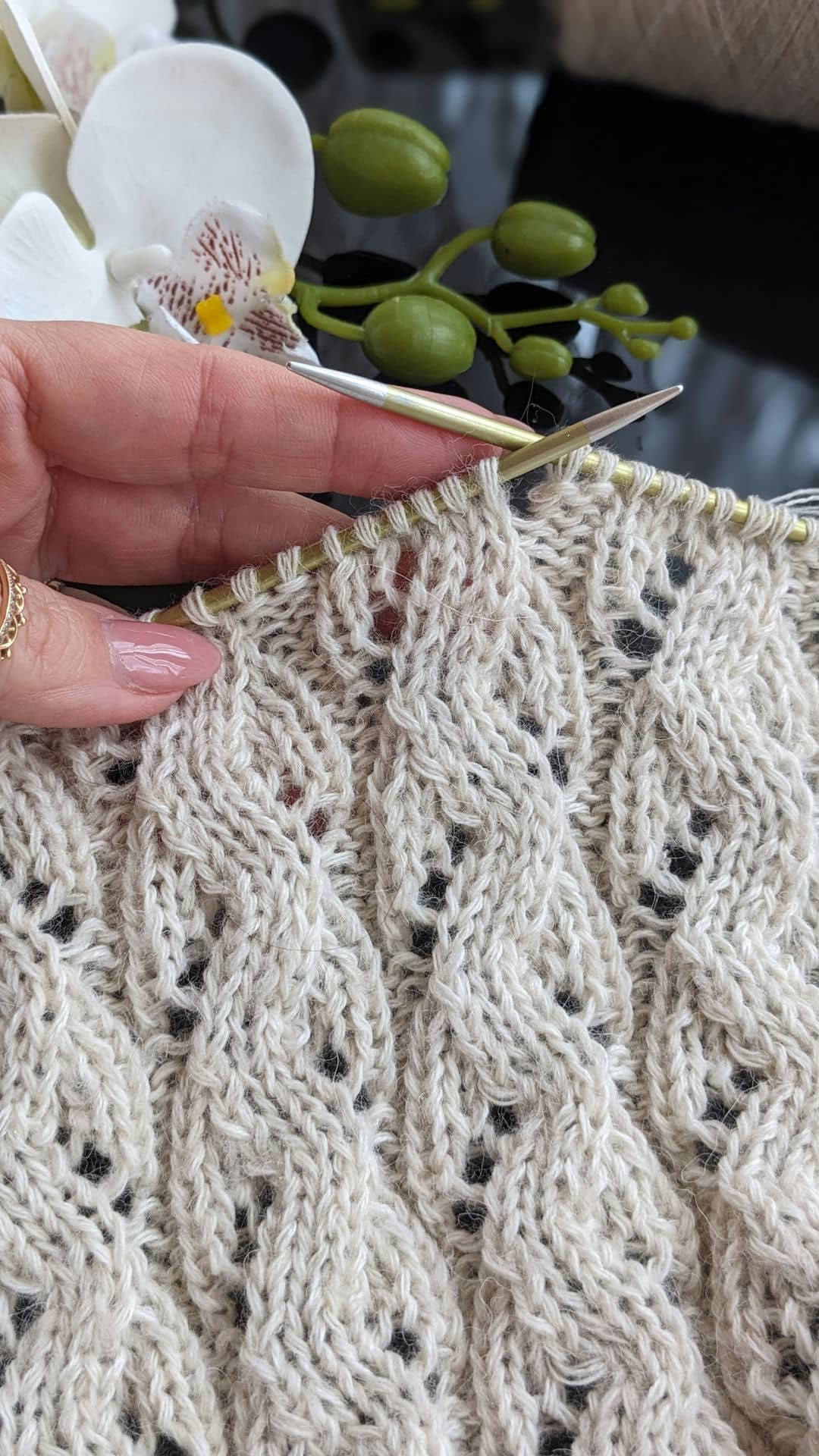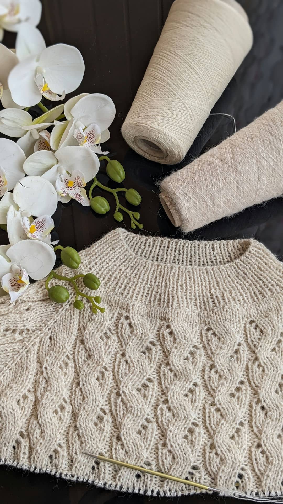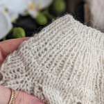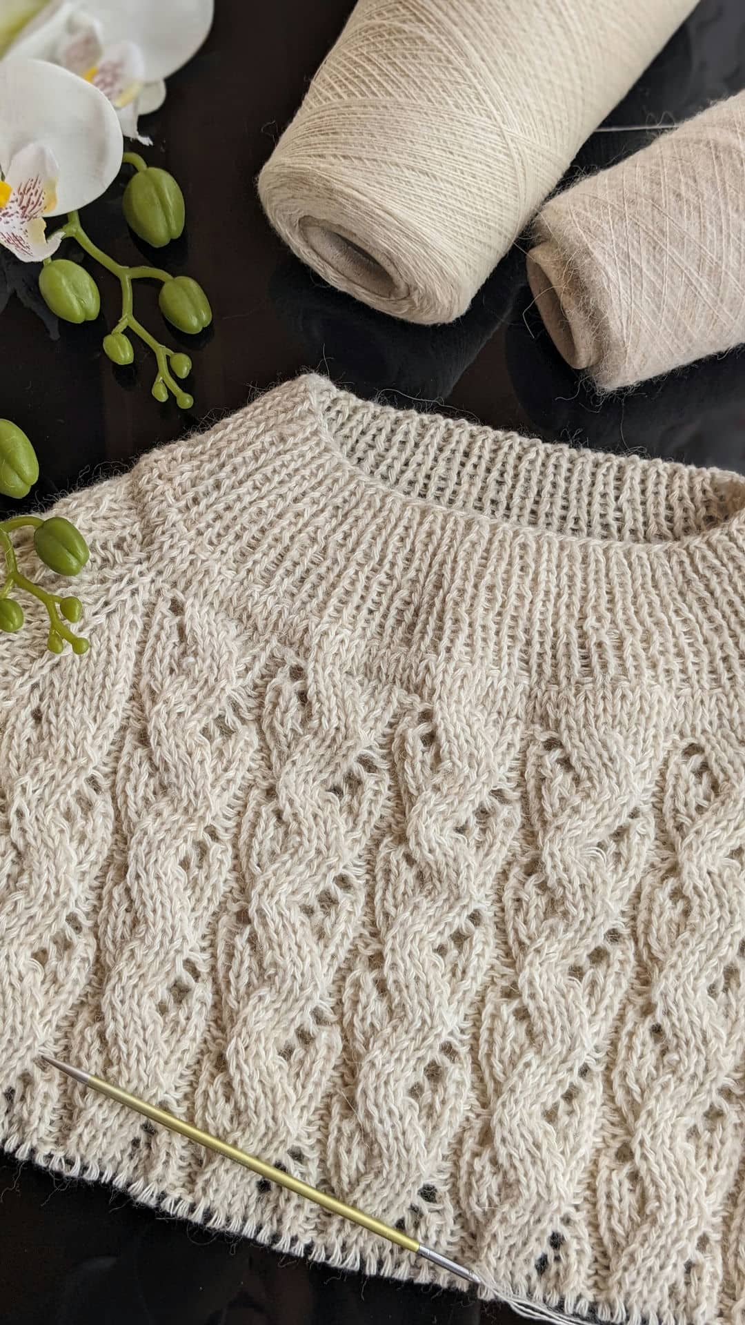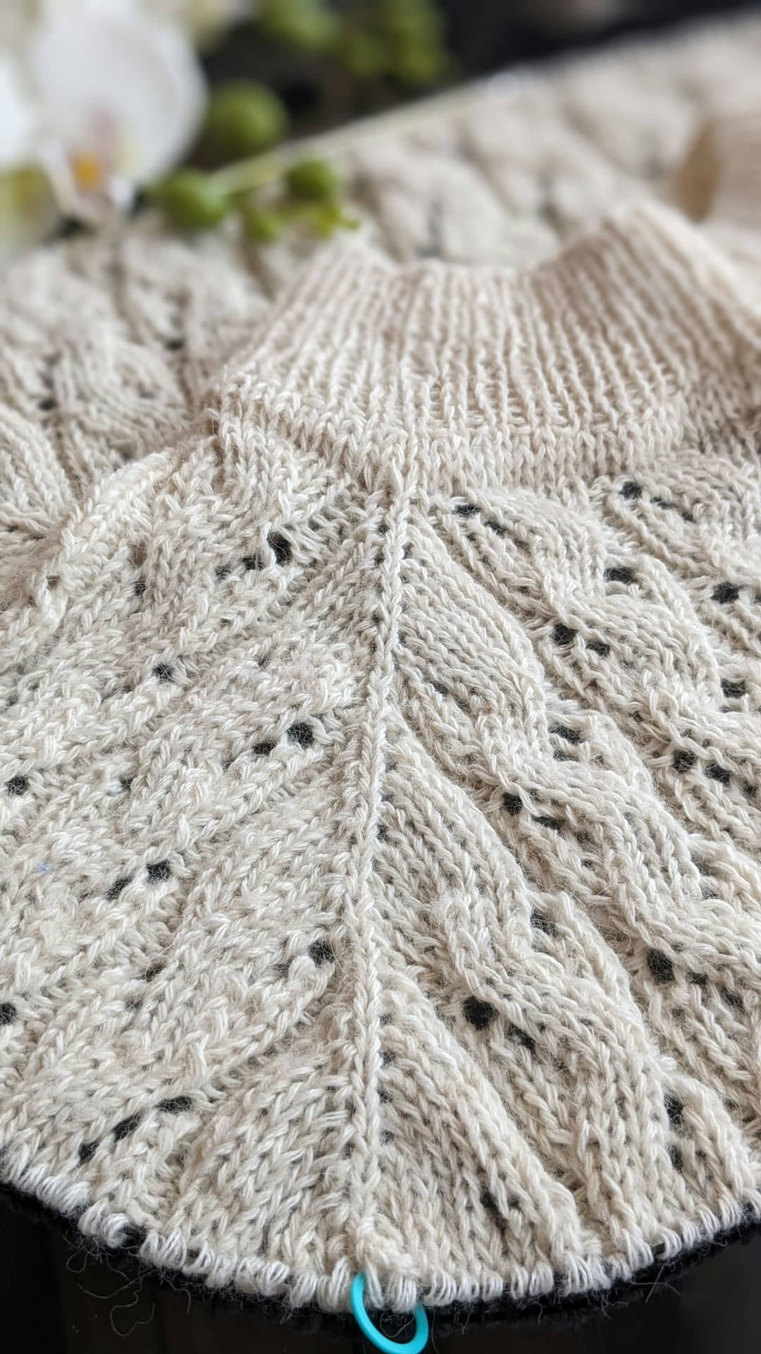 Горловина готова. Переходимо до основного полотна та ажурного візерунку. Розмір спиць міняємо на №4.