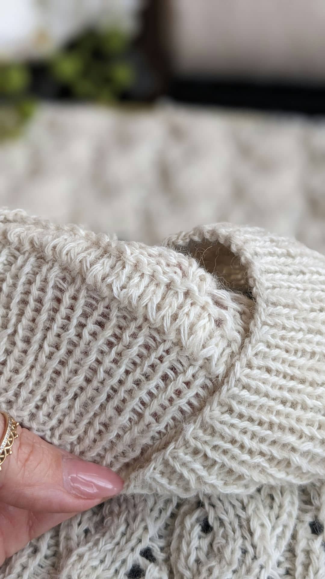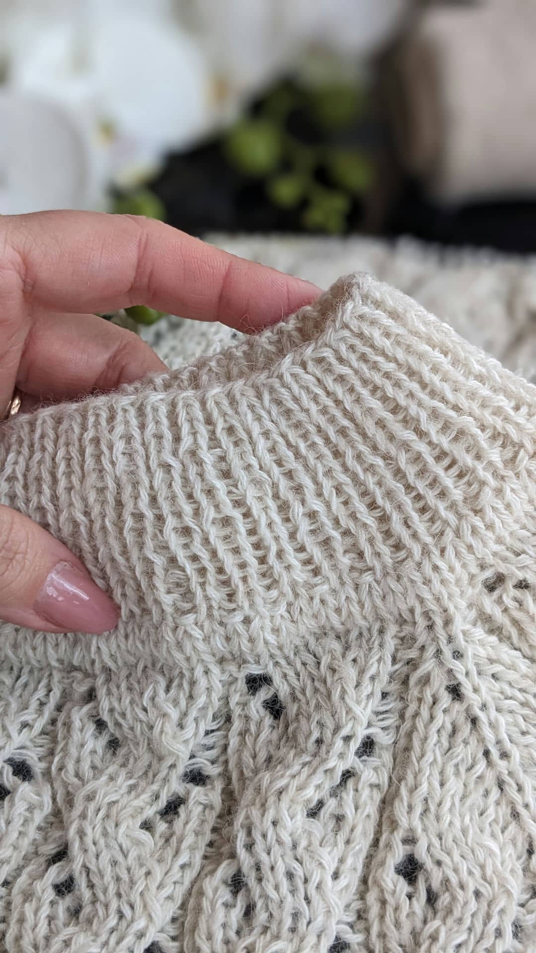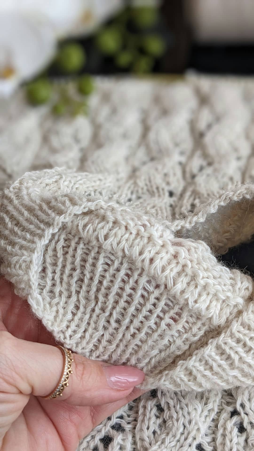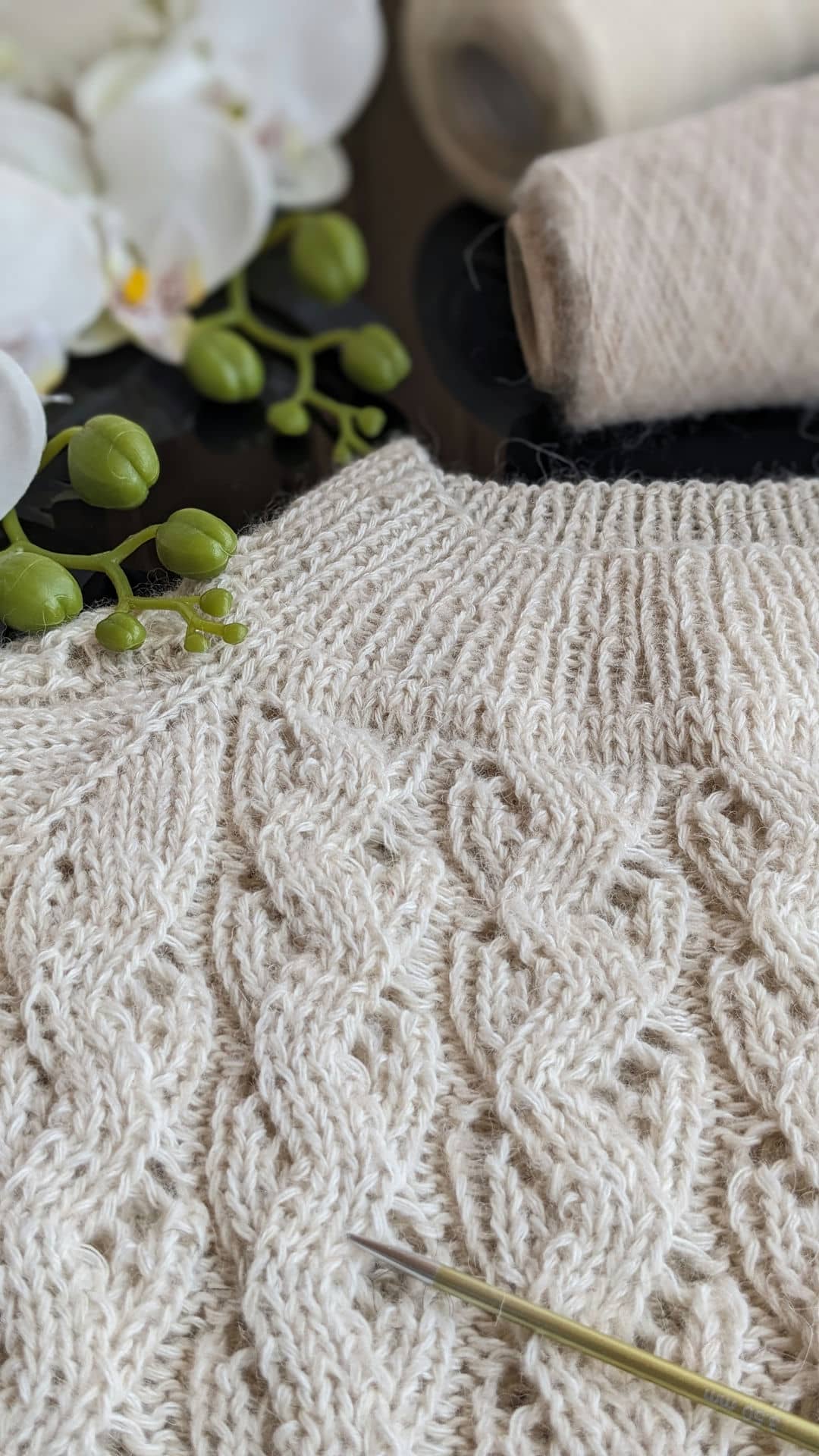 Горловина готова. Переходимо до основного полотна та ажурного візерунку. Розмір спиць міняємо на №4.