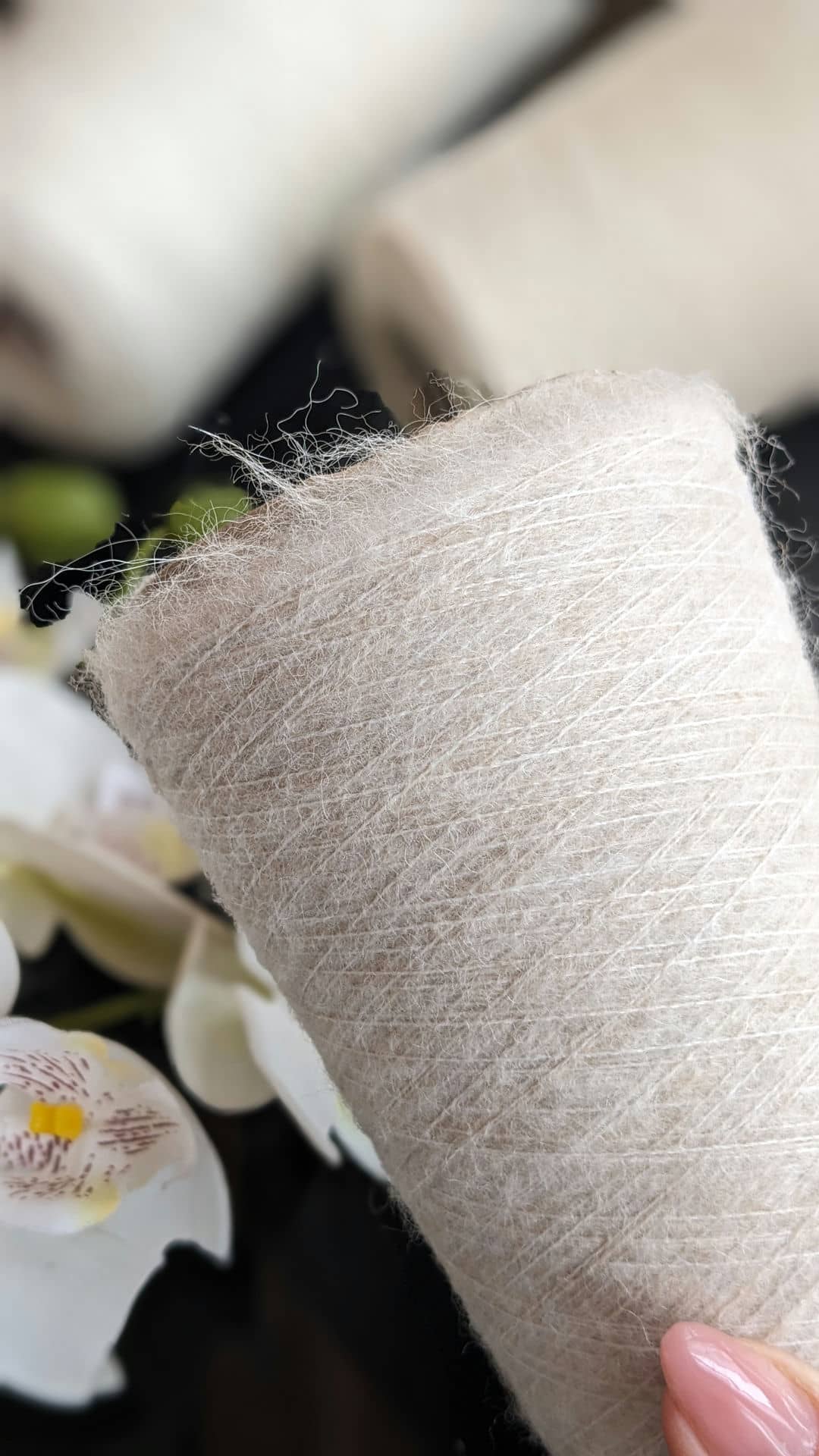 • мохер кольору бежевий меланж — для легкого серпанку та повітряної фактури, 900м/100г (одна нитка).