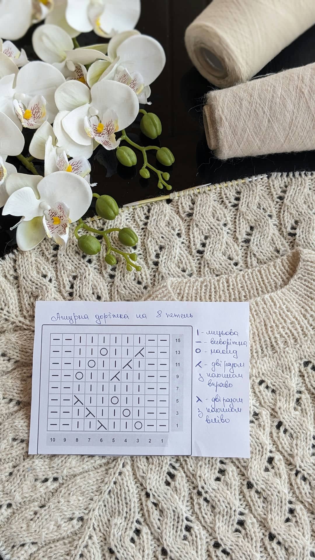 🔹 Рапорт візерунка: 8 петель + 2 петлі для симетрії + 2 крайові для в’язання зворотніми рядами.