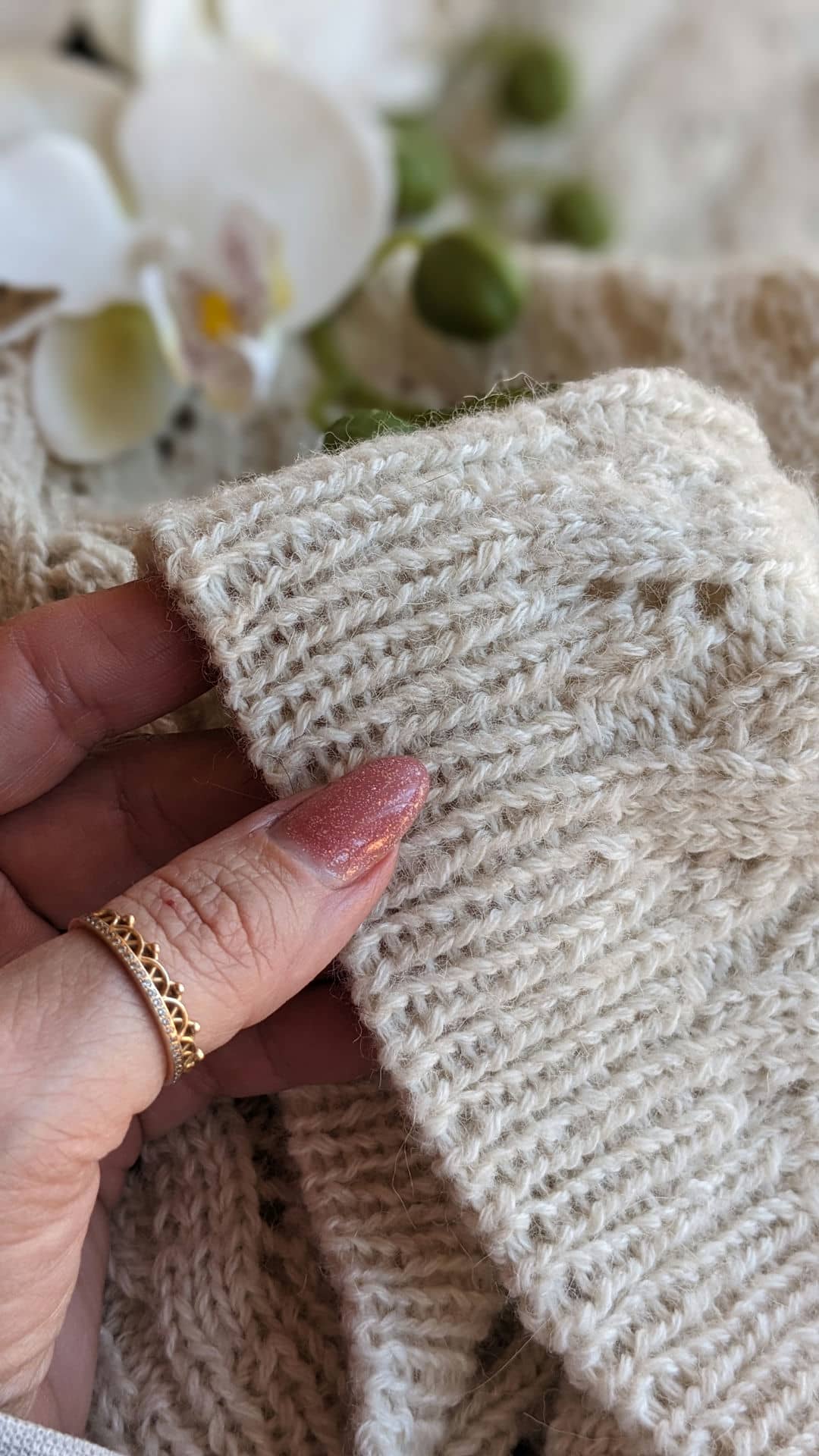В’яжемо рукава на необхідну довжину. Перед манжетом виконала рівномірне зменшення ще на 8 петель: 64 – 8 = 56 петель.