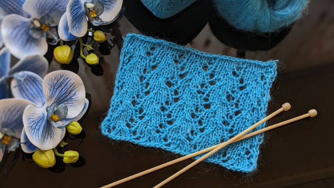 Рапорт візерунка 6 петель + 1 петля для симетрії + 2 крайові, якщо в’язати зворотніми рядами.