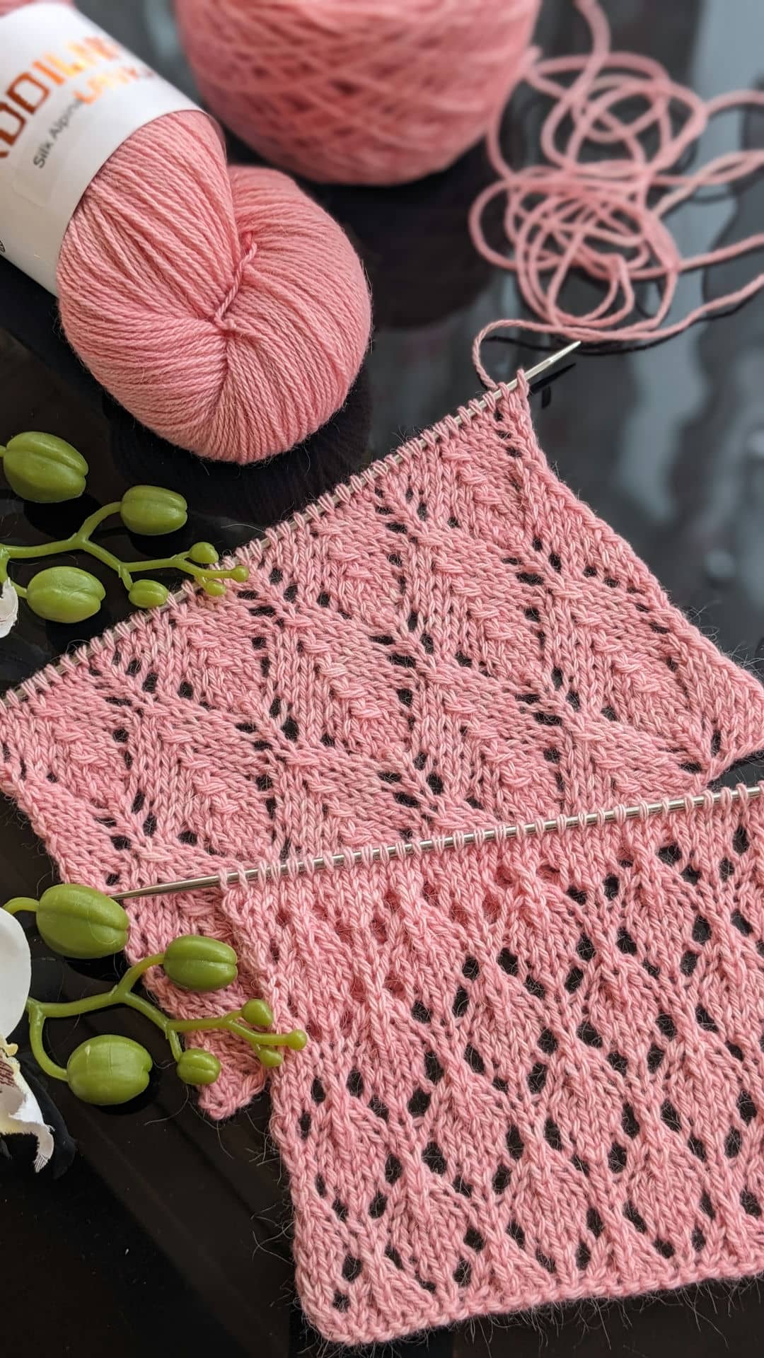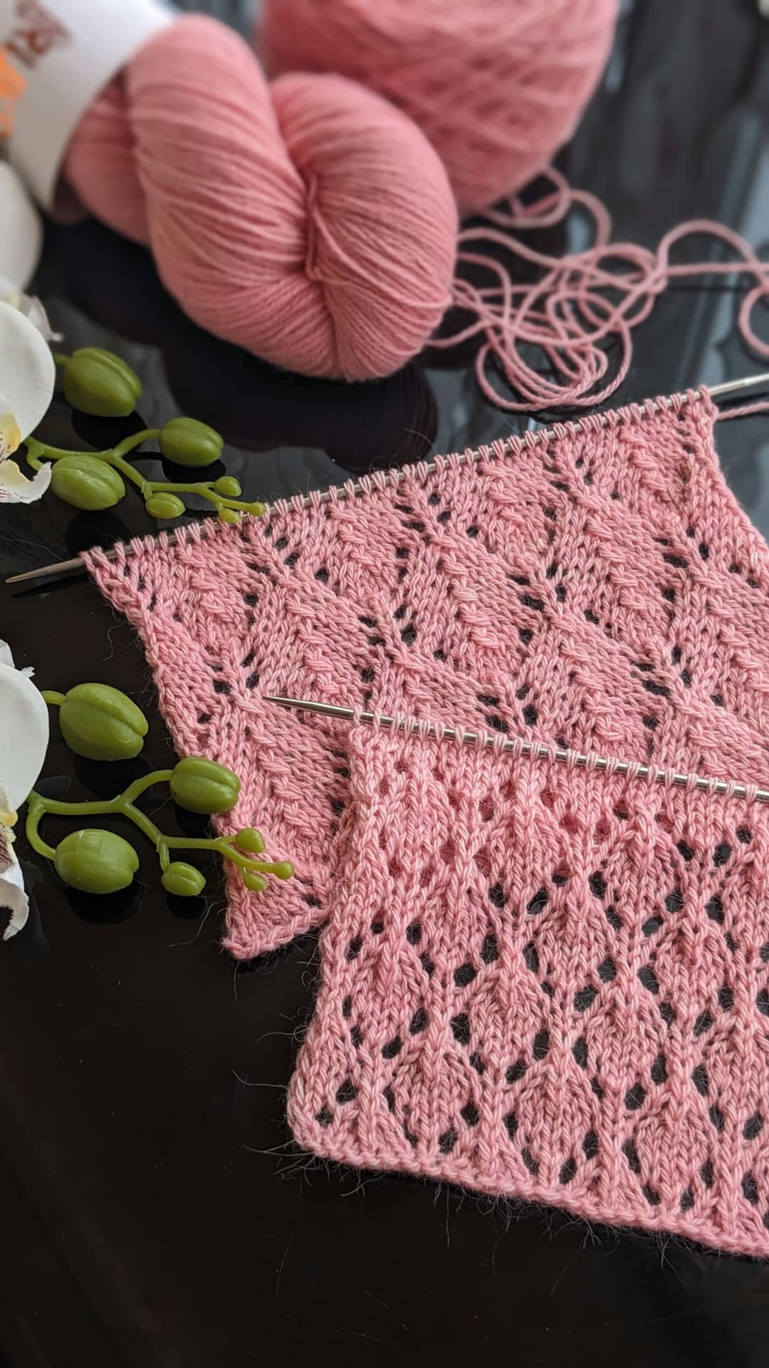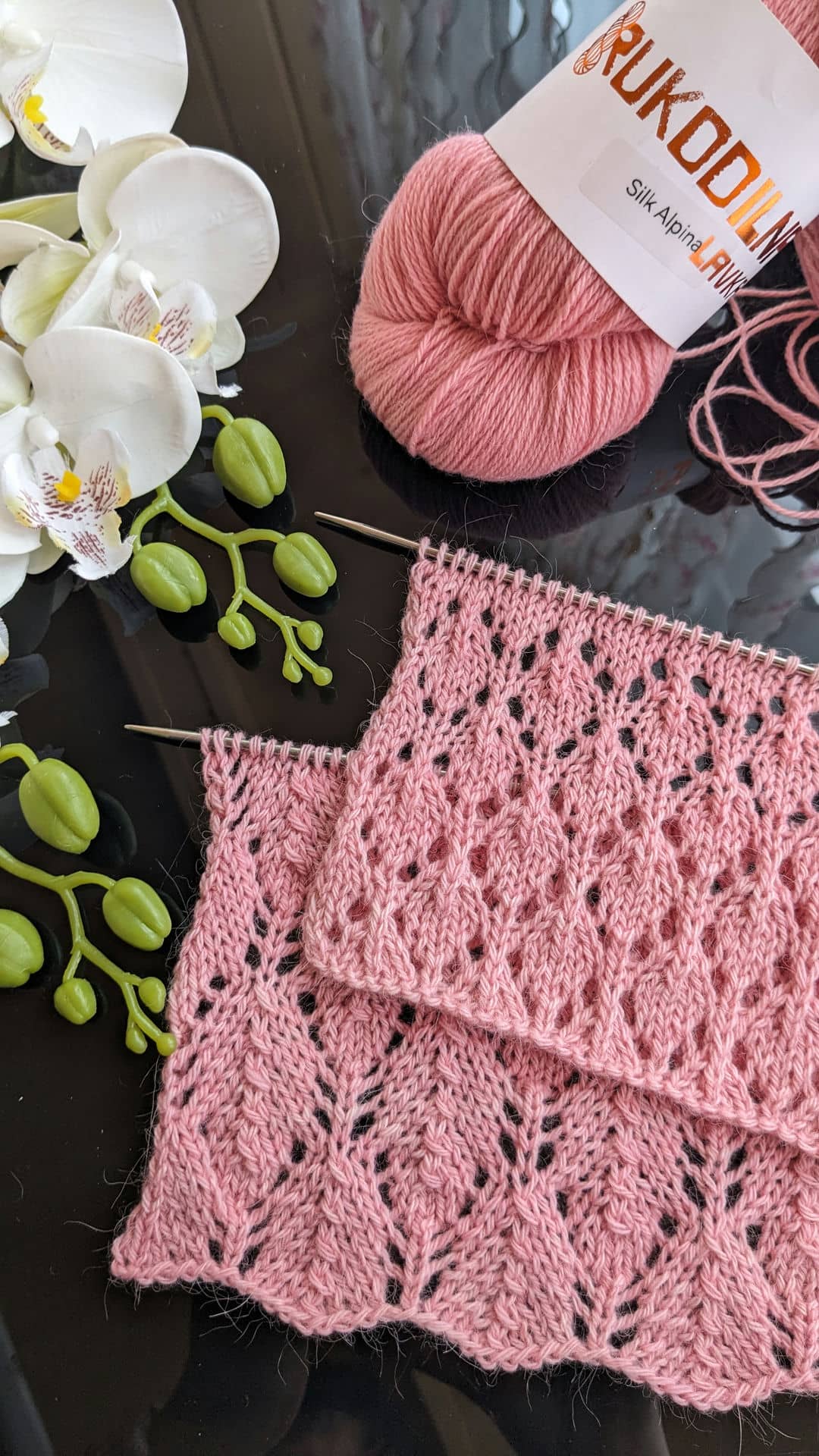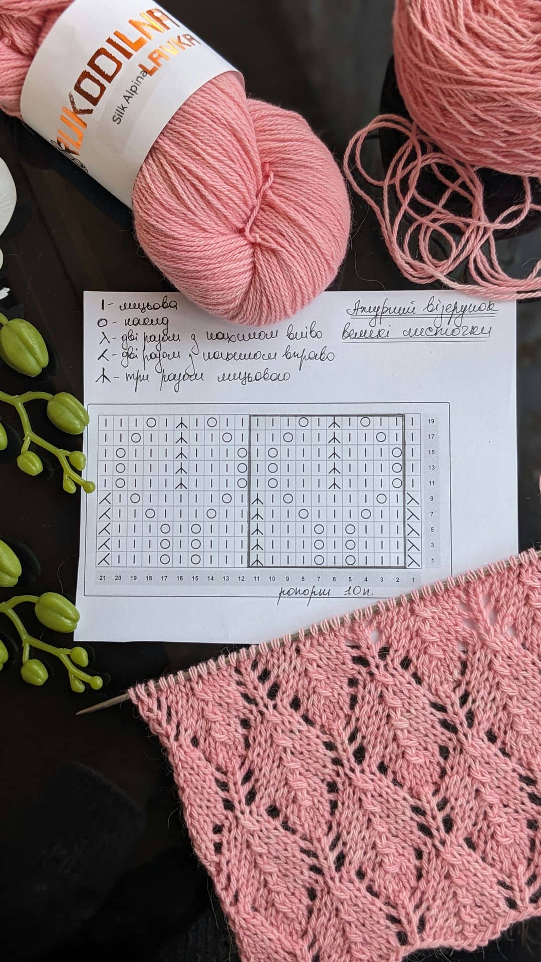 Для зразків була обрана пряжа зі складом: альпака, меринос і шовк — поєднання, яке ідеально підкреслює ажур. Метраж 400м/100г, спиці №3,5.
