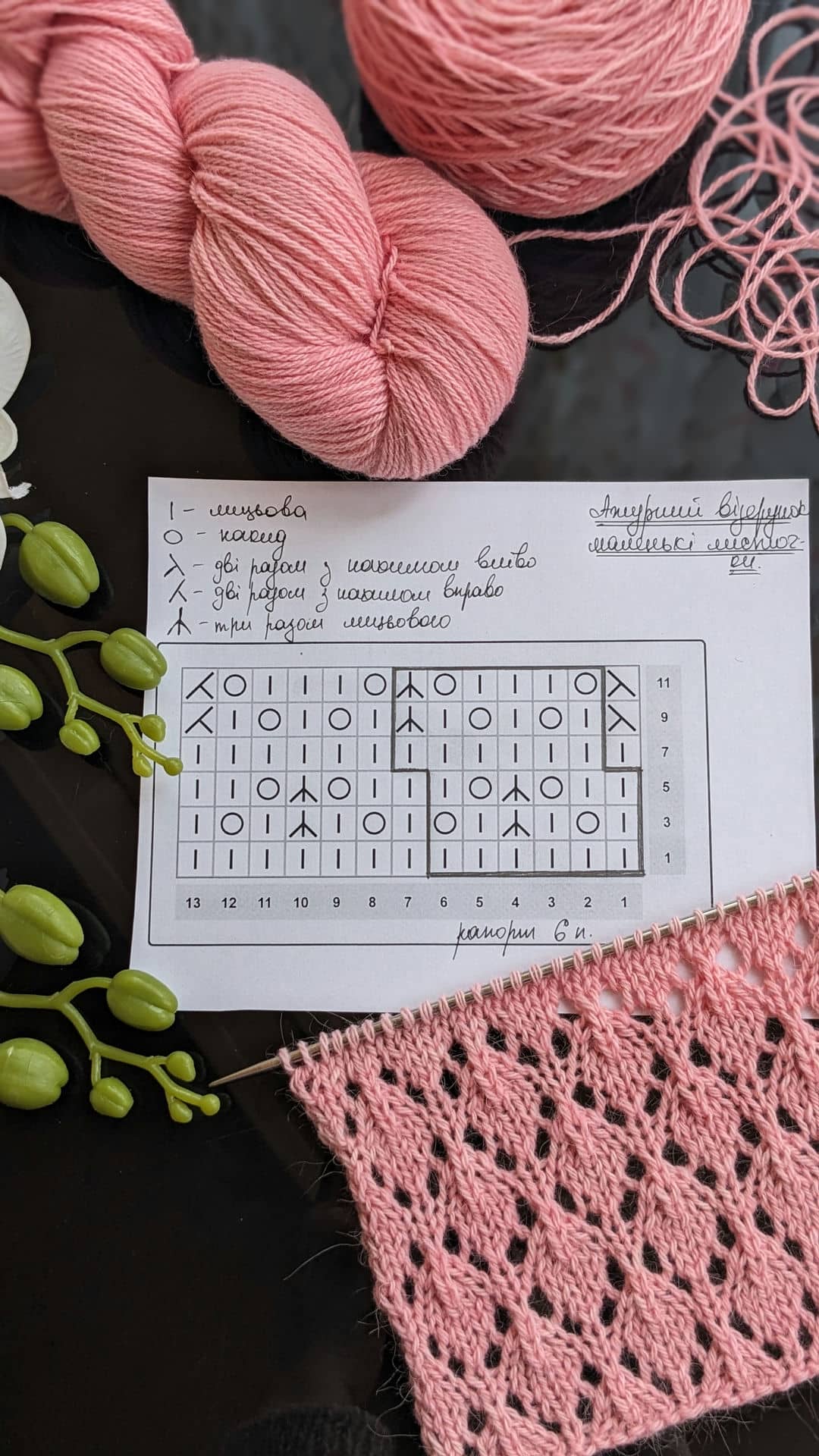 Рапорт 6 петель. При в’язанні зворотніми рядами додаємо 1 петлю для симетрії та 2 петлі крайові. Схему додала нижче в галерею.