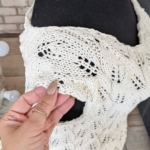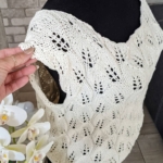 Основна частина майже готова. З’єднуємо відкриті петлі плечових скосів голкою, звичайним трикотажним швом (відео – частина 1).