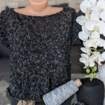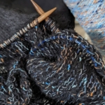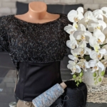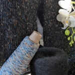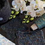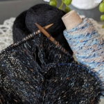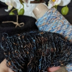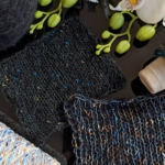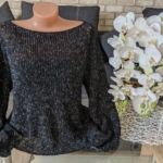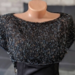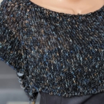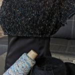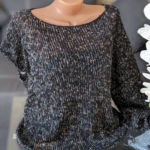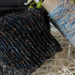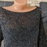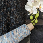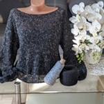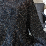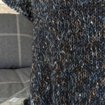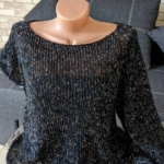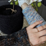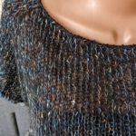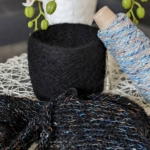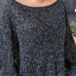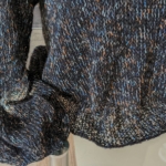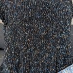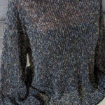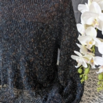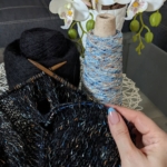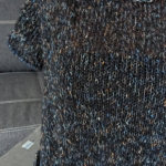 В этой модели я использовала мохер черного цвета (950м/100г) в сочетании с разноцветной фантазийной пряжей (1000м/100г). Получилось интересное меланжевое полотно. А для плотности добавила тонкую нить мериноса (1500м/100г).