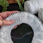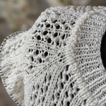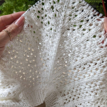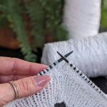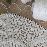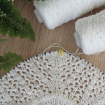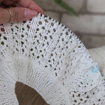 11 ряд: усі петлі на спицях в’яжемо як лицьові, а між петлями (з протяжки) формуємо нові петлі, в’яжемо їх як виворітні. Кількість петель у цьому рядку подвоюється, 112 х 2 = 224 петлі.
