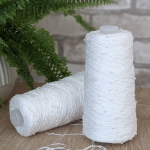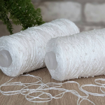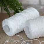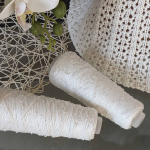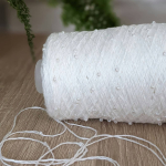 В роботі бобінна пряжа, 100% котон, змотана з шести тоненькх ниток, на які нанизані дрібні намистини. Вага бобінок 320-330 г, метраж 1000 м. Спиці №3,5 та №4.
