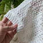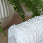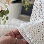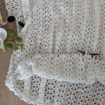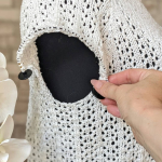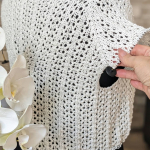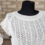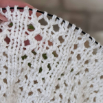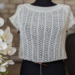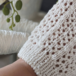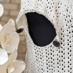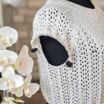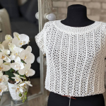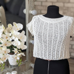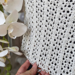 Особливого шарму полотну додає ажурний візерунок у вигляді вертикальних сітчастих доріжок. Подекуди між петельками мережива розташовані ніжні перлинки, які грайливо заповнюють простір. Візерунок виглядає дуже делікатно та гармонійно, не перевантажуючи образ, а навпаки — підкреслюючи легкість і витонченість виробу.