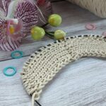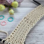 Розрахунки даю на розмір 48-50. Кардиган в’яжеться зверху донизу єдиним полотном. В’язання кардигана розпочинаємо з коміра – планки. Планка буде становити 11 петель. Тому, з будь-якої допоміжної пряжі, набираємо гачком ланцюжок з 11 повітряних петель. Далі з кожної повітряної петлі основною пряжею формуємо нові петлі та одягаємо їх на спицю (дивись відео – Частина 1). Починаємо в’язати смужку резинкою 1х1, приблизно 8-9 см. Робочу нитку відрізаємо. Повертаємось до початкового ланцюжка з повітряних петель. Розпускаємо його, а відкриті петлі підхоплюємо на спицю. В’яжемо смужку в іншу сторону теж 8-9 см. Довжина планки має дорівнювати половині обхвату шиї. У мене обхват шиї 34 см: 34/2=17 см.