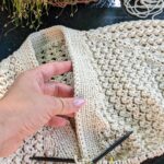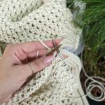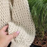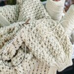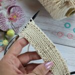 Далі переходимо на в’язання рукавів. На додаткових канатиках для кожного рукава маємо по 65 петель. По краю підріза та ростка набираємо додаткові петлі. Якщо петель виявилось забагато, то в наступному рядку виконуємо зменшення до небхідної кількості. Полотно рукавів в’яжемо зворотніми рядками.