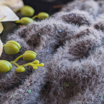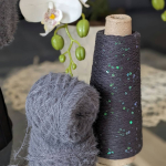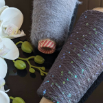 Бавовна із вкрапленнями дрібних пайєток, у свою чергу, виконує роль структурної основи. Вона стабілізує полотно, надає йому чіткішої форми та забезпечує комфортну щільність. А пайєтки, розсіяні по всій довжині нитки, додають легкого блиску.
