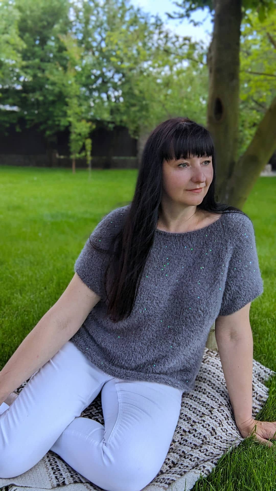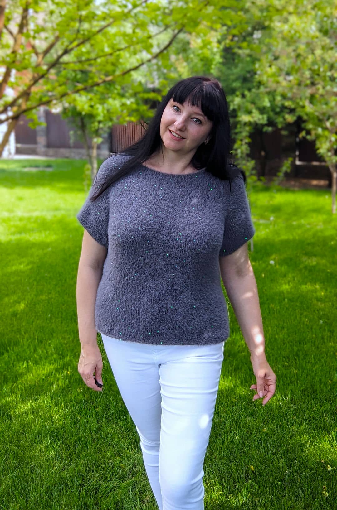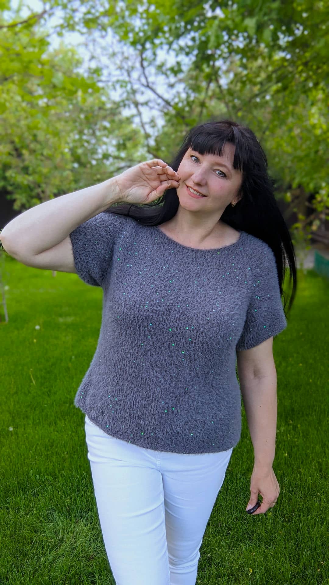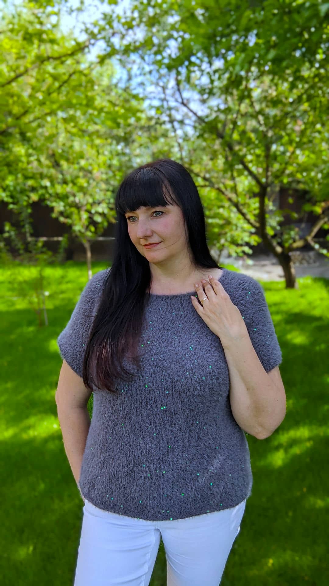 Модель футболки — лаконічна та водночас вишукана. Це класичний реглан зверху, що в’яжеться єдиним полотном без швів. Прямий силует забезпечує універсальність та комфорт у носінні, підходить до різних типів фігури й легко комбінується з іншими елементами гардеробу. Футболка виконана виключно лицьовою гладдю — жодних візерунків, лише чисте, рівне полотно, яке підкреслює фактурну гру ниток та м’яке мерехтіння пайєток.