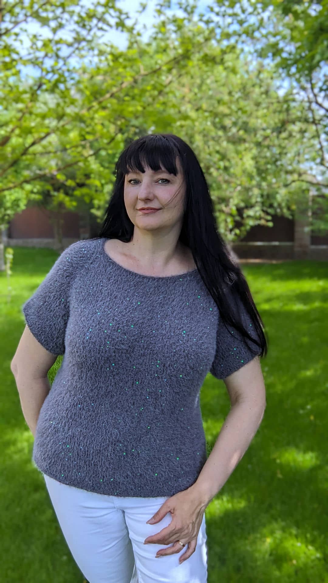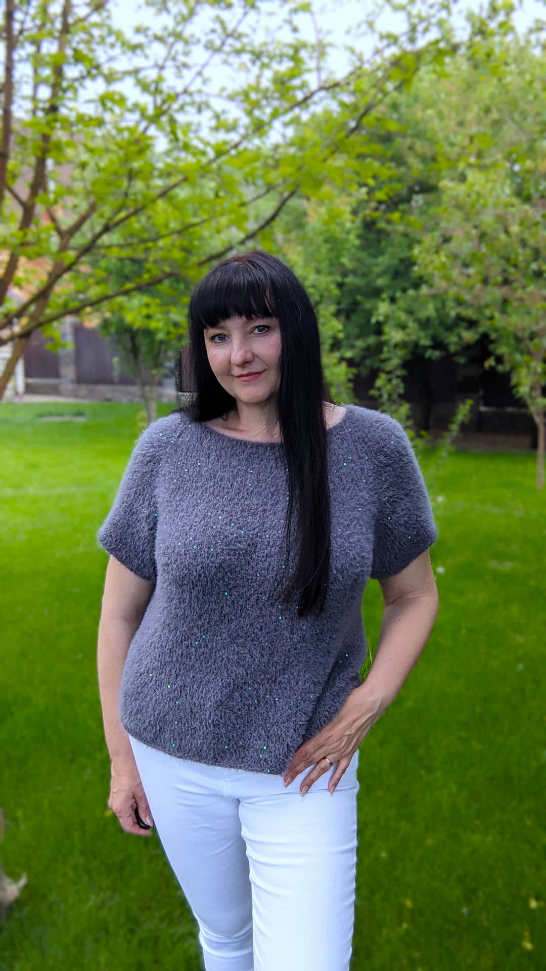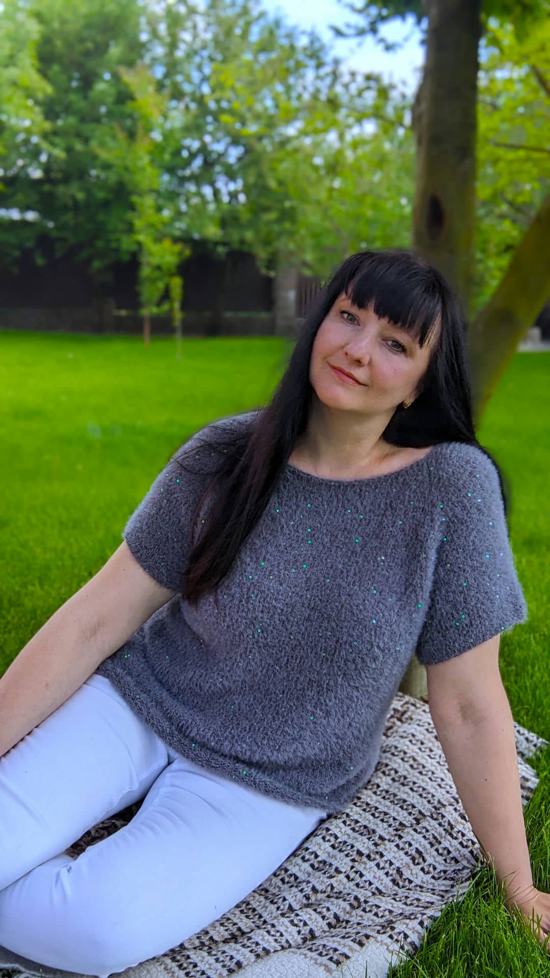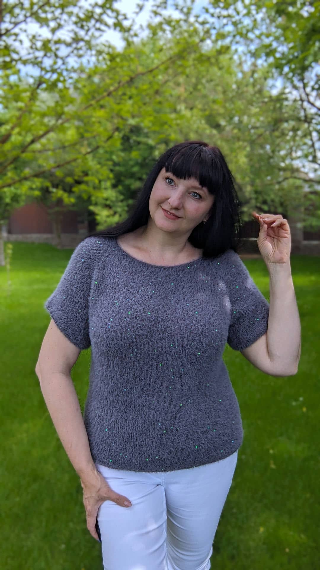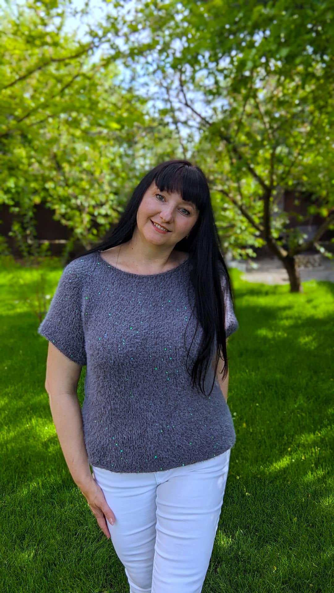 Модель футболки — лаконічна та водночас вишукана. Це класичний реглан зверху, що в’яжеться єдиним полотном без швів. Прямий силует забезпечує універсальність та комфорт у носінні, підходить до різних типів фігури й легко комбінується з іншими елементами гардеробу. Футболка виконана виключно лицьовою гладдю — жодних візерунків, лише чисте, рівне полотно, яке підкреслює фактурну гру ниток та м’яке мерехтіння пайєток.
