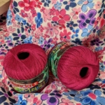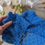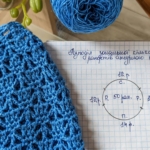 Розпочинаю з кокетки. Для неї маю залишки напівбавовни, товщина пряжі 350м/50г, в’яжу в дві нитки, гачок №3.