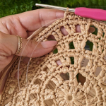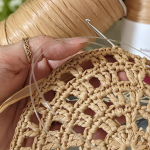 27 ряд – стовпчики без накиду. Знову виконую розширення полотна. Після кожного 15-го стовпчика пров’язую ще один у вершину стовпчика попереднього рядка чи над ПП. Всього по колу додала 8 стовпчиків без накиду, 120 + 8 = 128 стовпчиків.
