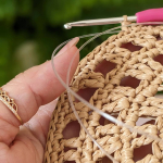 29 ряд – стовпчики без накиду. Знову виконую розширення полотна. Після кожного 16-го стовпчика пров’язую ще один у вершину стовпчика попереднього рядка чи над ПП. Всього по колу додала 8 стовпчиків без накиду, 128 + 8 = 136 стовпчиків.