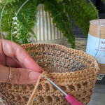 23 ряд – стовпчики без накиду. Знову виконую розширення полотна. Після кожного 13-го стовпчика пров’язую ще один у вершину стовпчика попереднього рядка чи над ПП. Всього по колу додала 8 стовпчиків без накиду, 104 + 8 = 112 стовпчиків.