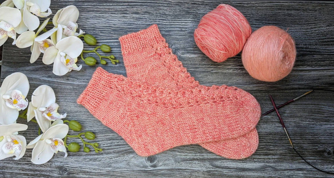 Пряжа: мікс двох видів — меланжева шкарпеткова ручного фарбування (400м/100г) та напіввовна (500м/100г). Поєднання двох видів пряжі створює цікаву фактуру: шкарпетки виглядають об’ємнішими, а відтінок стає м’яким, пастельним і особливо ніжним. Спиці: №4 на канатику.