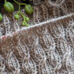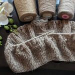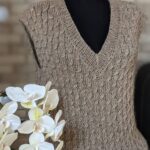 Одночасно для формування горловини в кожному другому рядку (або в кожному лицьовому рядку) виконуємо зменшення петель біля крайової петлі горловини, пров’язуючи по дві петлі разом лицьовою.