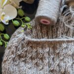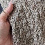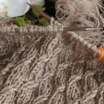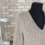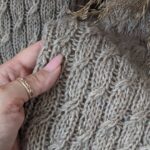 Пуловер в’яжемо знизу догори. Для основного полотна на спиці №4,5 набираємо 208 петель + 1 петля для з’єднання в коло. Виконуємо 20 рядків резинкою 1х1. Переходимо на рельєфний візерунок. В’яжемо спинку/перед єдиним полотном до рівня пройми. У мене довжина полотна від низу до пройми 40 см.