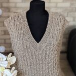 Через 20 см від пройми починаємо формувати скоси плеча вкороченими рядками. В кінці кожного 2-го рядка (зі сторони пройми) не дов’язуємо по 4 петлі. Формуємо 6 таких груп для кожного плеча.
