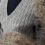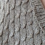 По краю горловини набираю з лицьової сторони 81 петлю, і так само з виворітної сторони. Разом 81 + 81 = 162 петлі. В’яжемо 8 кругових рядів резинкою 1х1. По центру частини переда пров’язуємо в кожному рядку 3 разом лицьовою так, щоб друга петля була поверх двох інших.Таким чином ми зформуємо мис. Далі виконуємо два рядка подвійною резинкою. Закриваємо петлі голкою, або будь – яким іншим зручним способом.