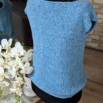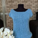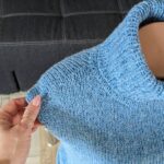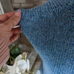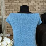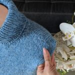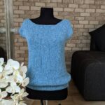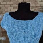 Через 40 см від початку в’язання всі петлі ділимо на дві рівні частини: перед та спинку – по 80 петель. Кожну частину продовжуємо в’язати окремо зворотніми рядками. Через 16 см від пройм починаємо формувати скоси плеча для обох деталей згідно схеми – малюнка, петлі залишаю відкритими.