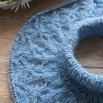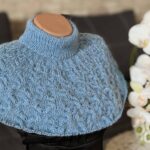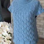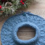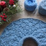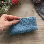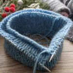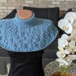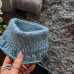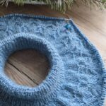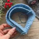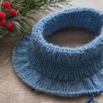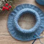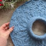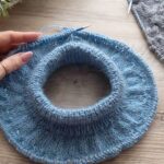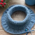 В’яжемо по колу резинкою 1х1 на висоту 7 см. Далі 2 рядка подвійної резинки (“полая резинка”). Далі знову 7 см резинкою 1х1. Петлі останнього рядка резинки та початкового рядка пров’язуємо разом, фіксуємо відворот подвійного комірця. Детально дивіться в відео нижче (частина 1).