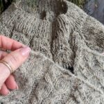 Петлі рукавів знімаю на додаткові канатики. Петлі ліній реглану віддаю в основне полотно. Переходимо на в’язання азіатського ростка зворотніми рядками, на петлях спинки + 4 петлі ліній реглана (по 2 петлі з кожної сторони).