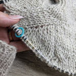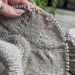 - виконуємо подвійне збільшення для переда (додаємо нову петлю з шостої петлі плеча, вводячи спицю на ряд нижче, наступну петлю додаємо у вигляді накиду),