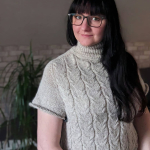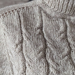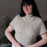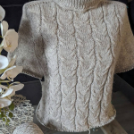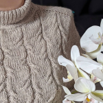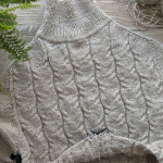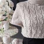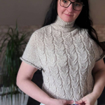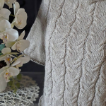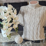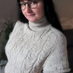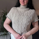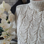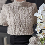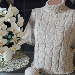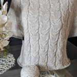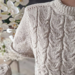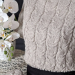 Починаємо в’язати кокетку зворотніми рядами та формувати класичний росток. Основна частина – смужки з косами, рукави – лицьова гладь.