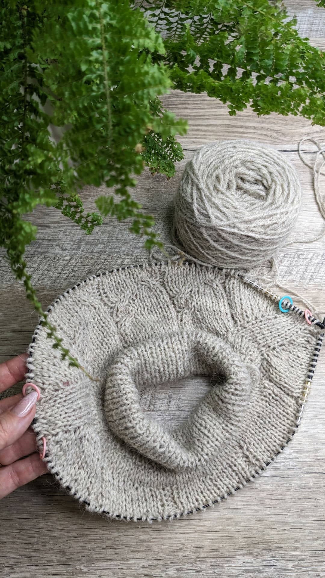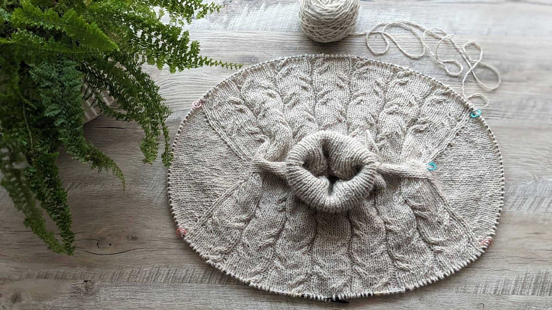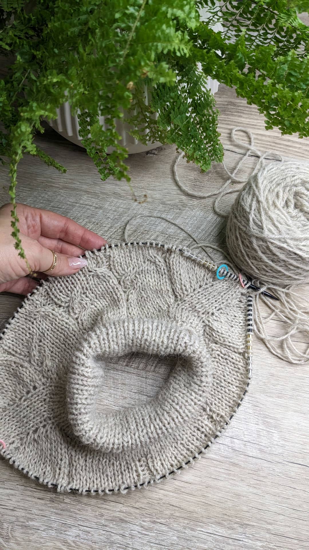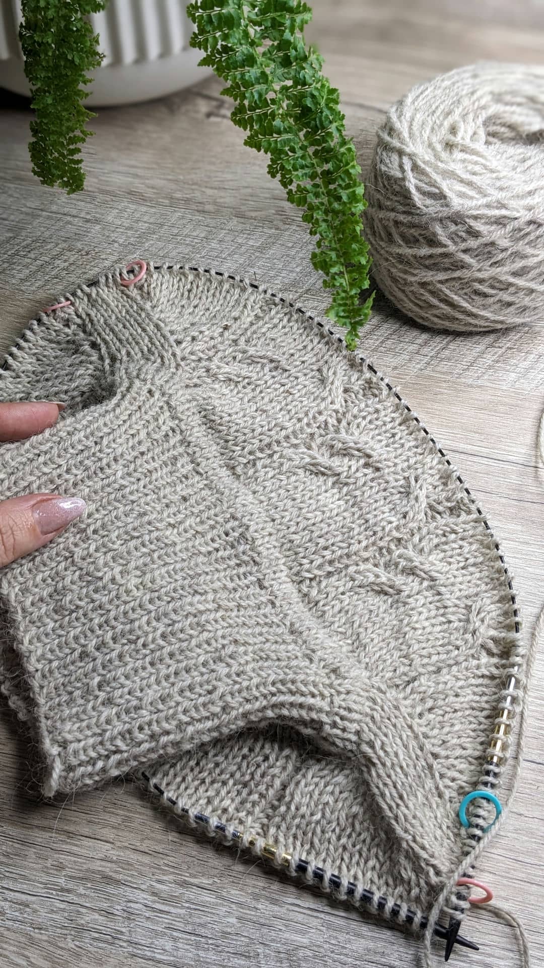 І далі, в цьому ж рядку, додаю наступні 14 петель переда та переходжу на в’язання кокетки по колу.