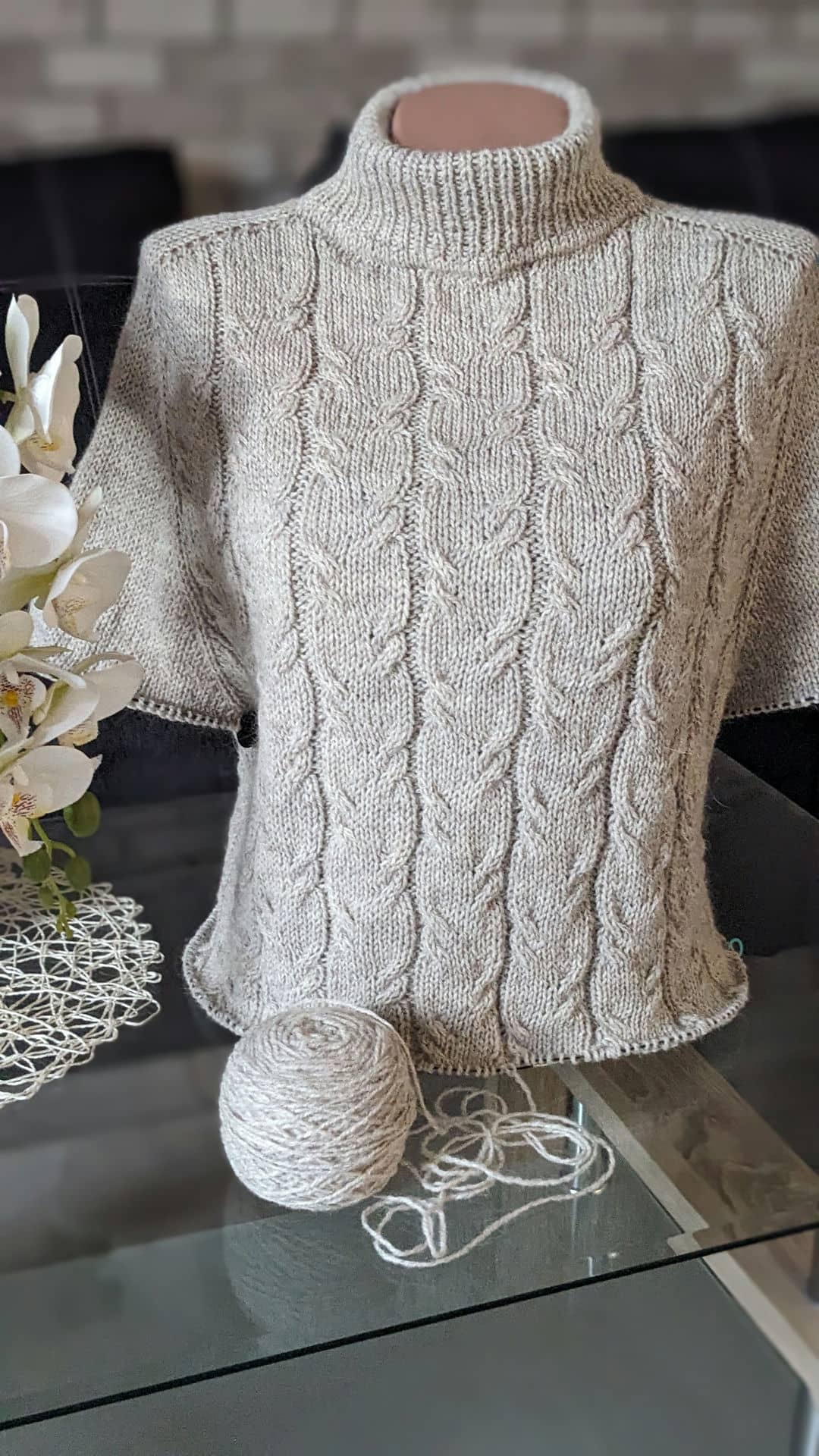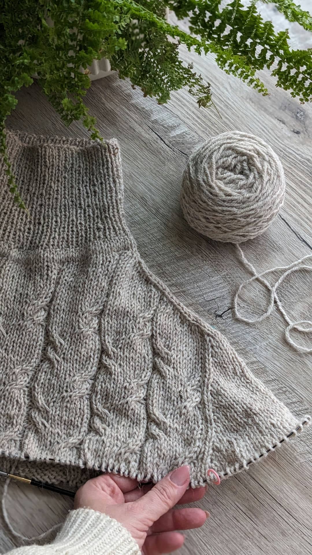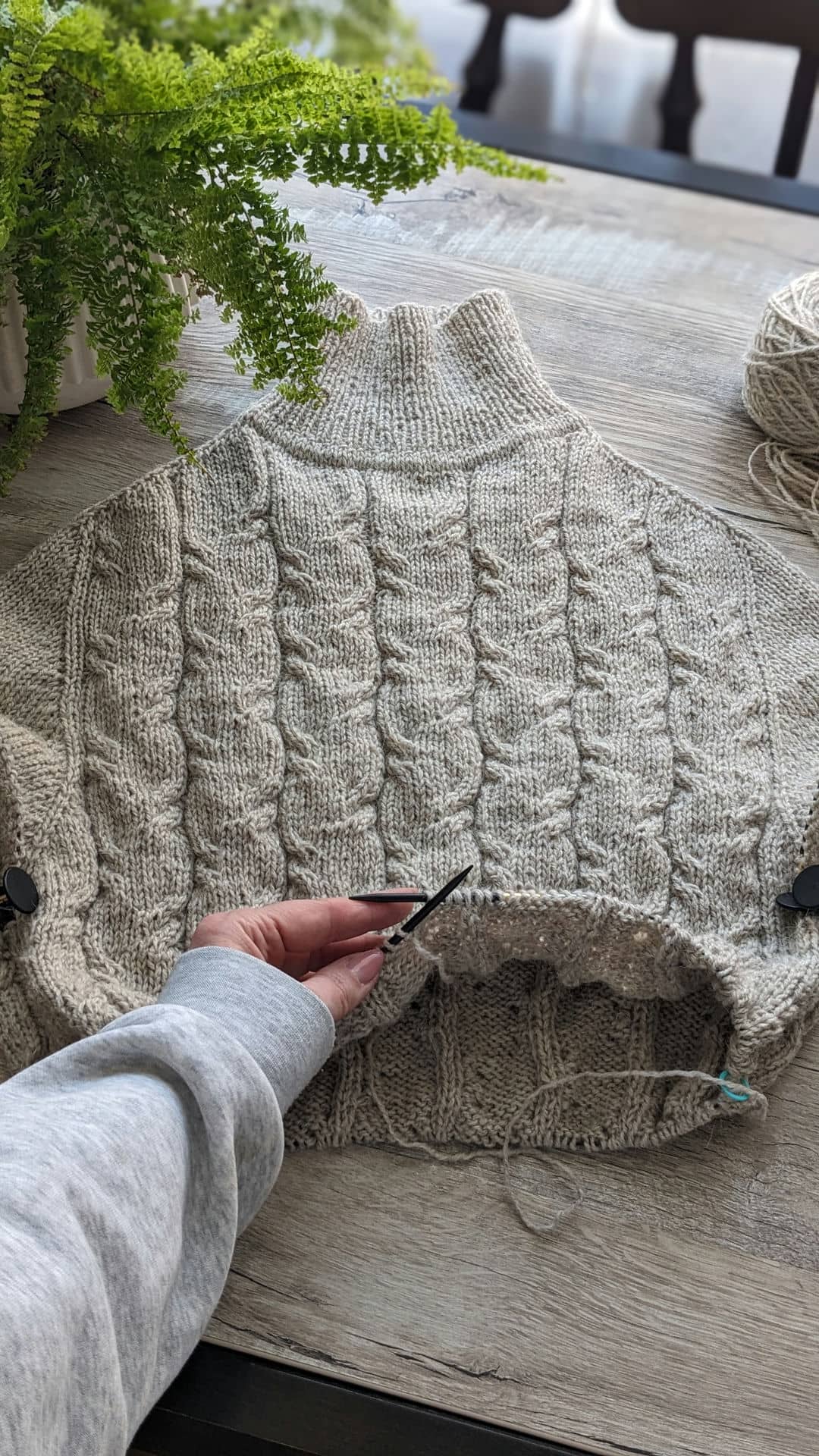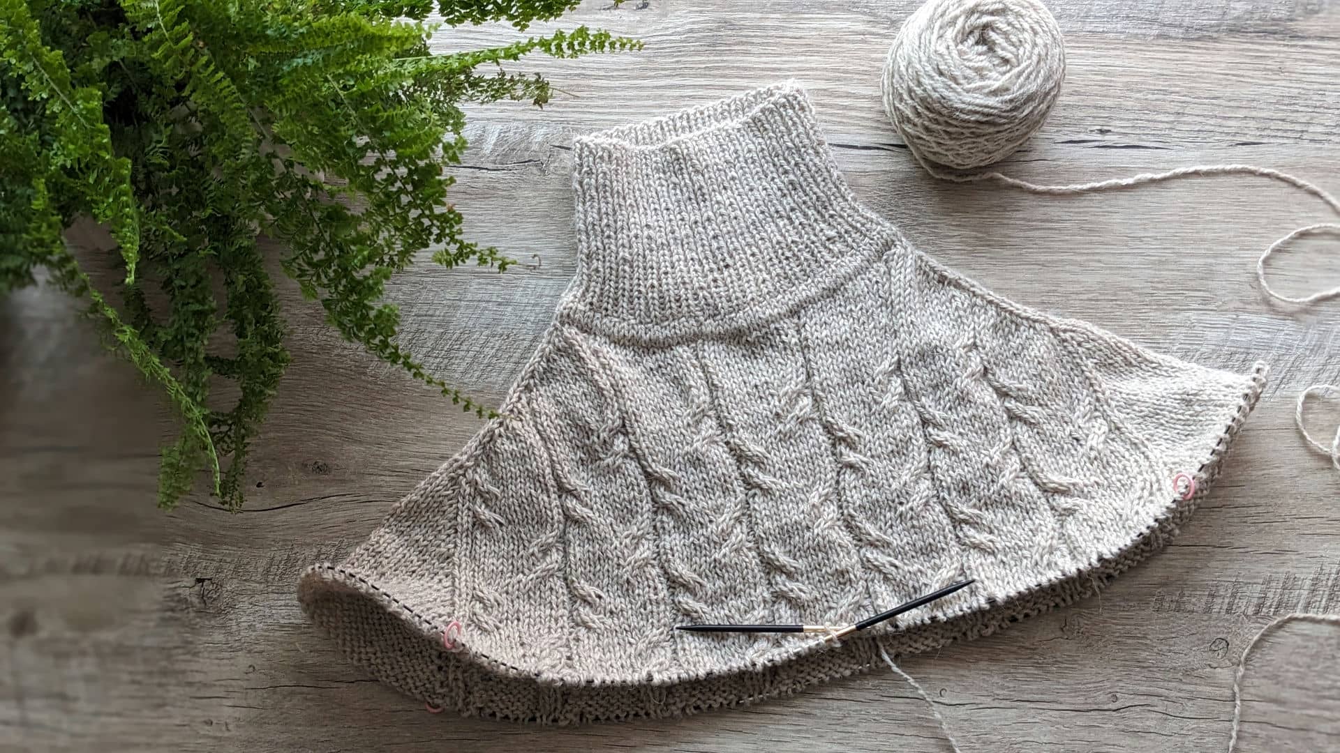 Починаємо в’язати кокетку зворотніми рядами та формувати класичний росток. Основна частина – смужки з косами, рукави – лицьова гладь.