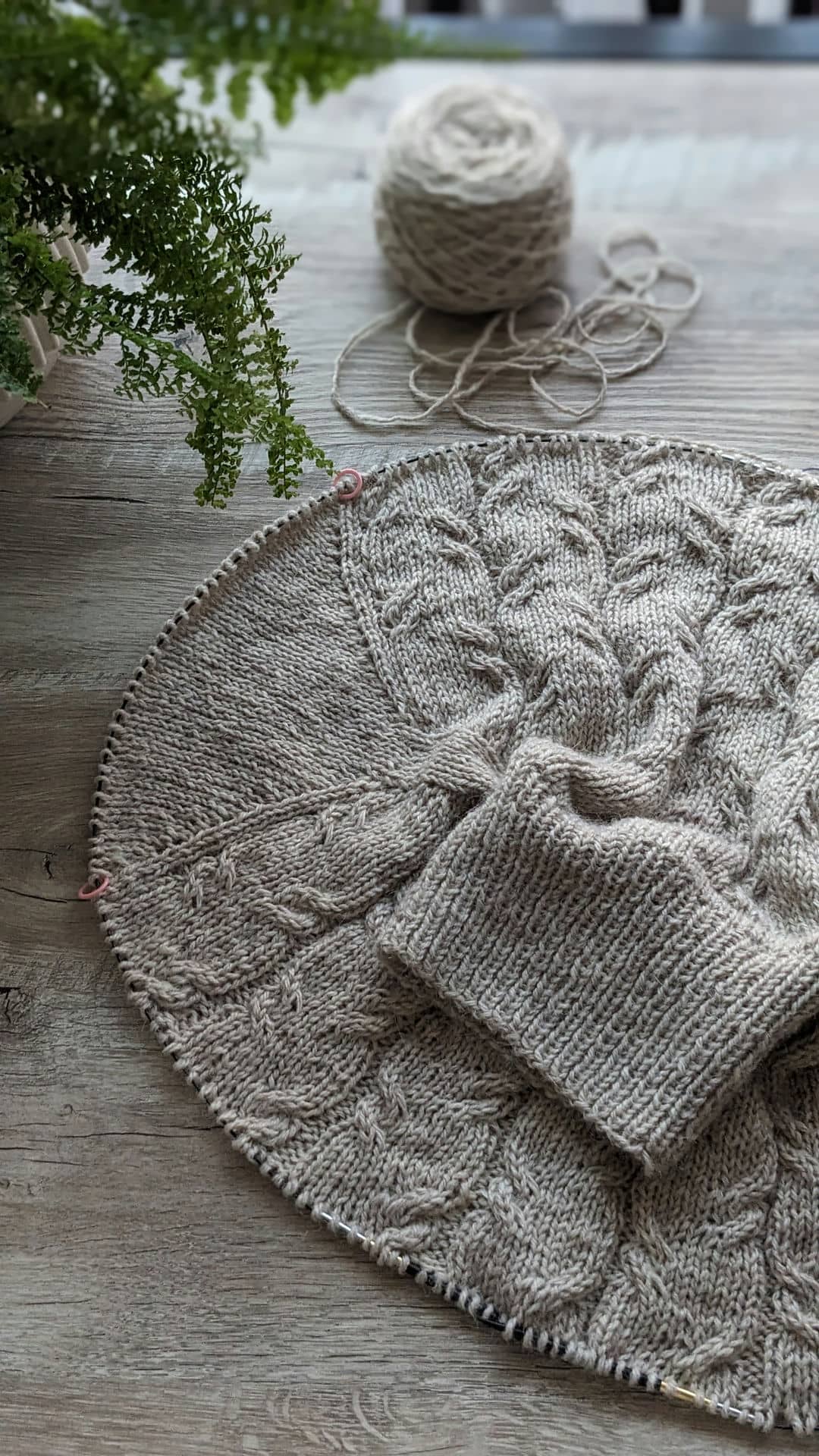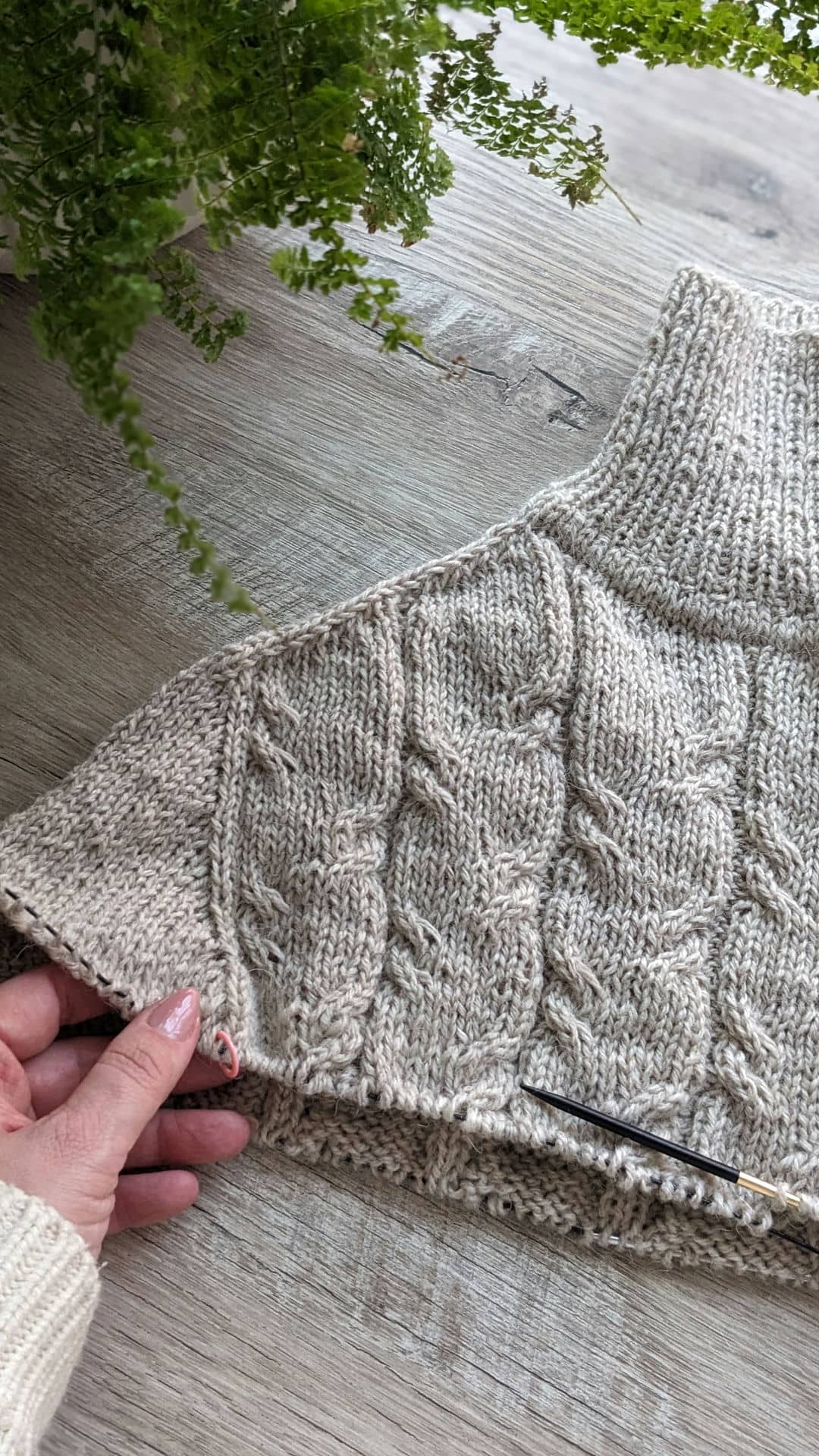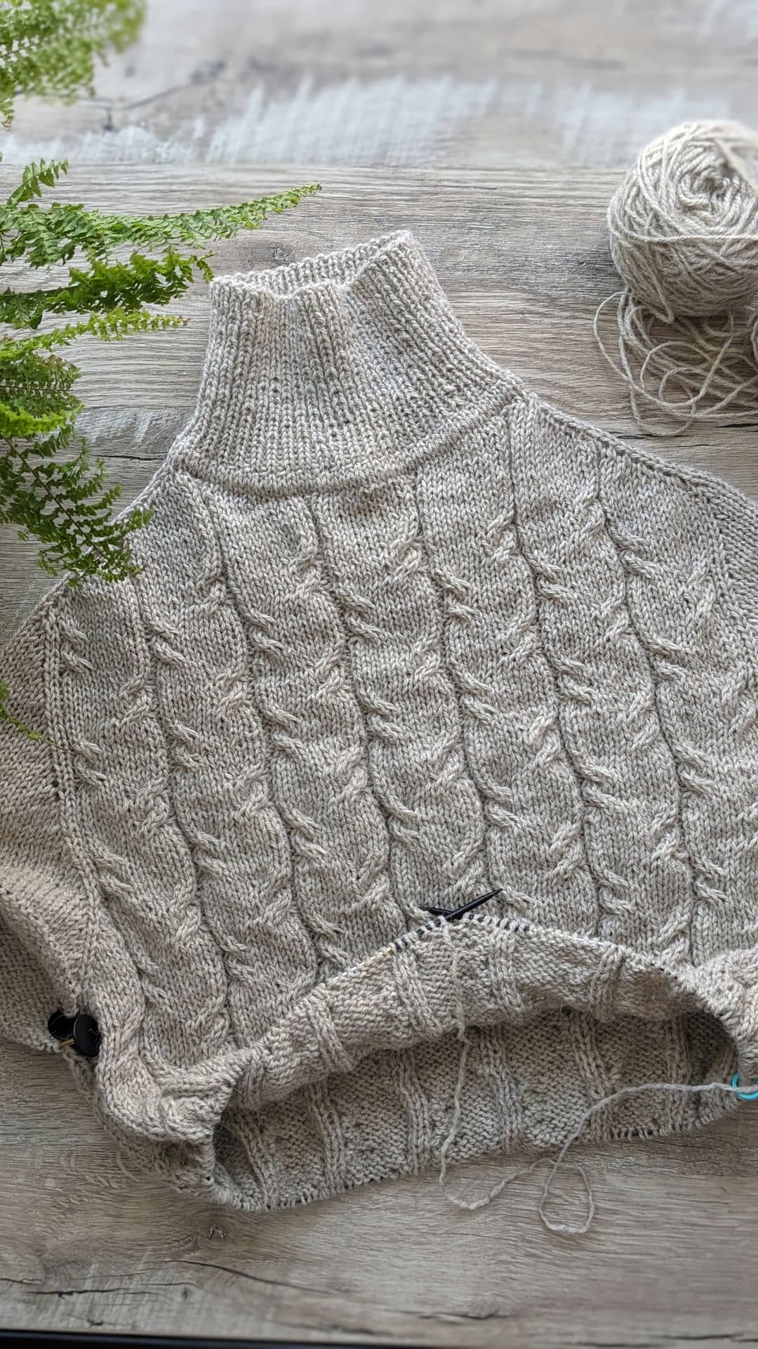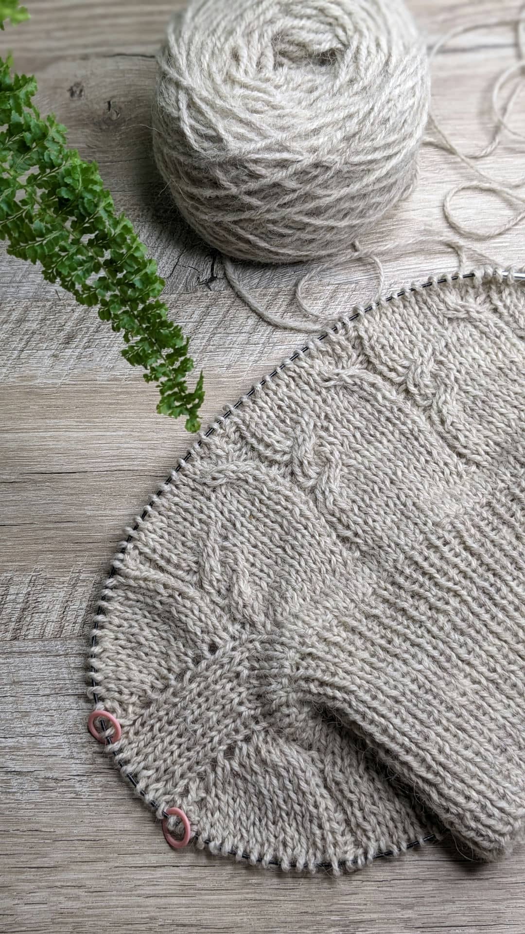 Починаємо в’язати кокетку зворотніми рядами та формувати класичний росток. Основна частина – смужки з косами, рукави – лицьова гладь.