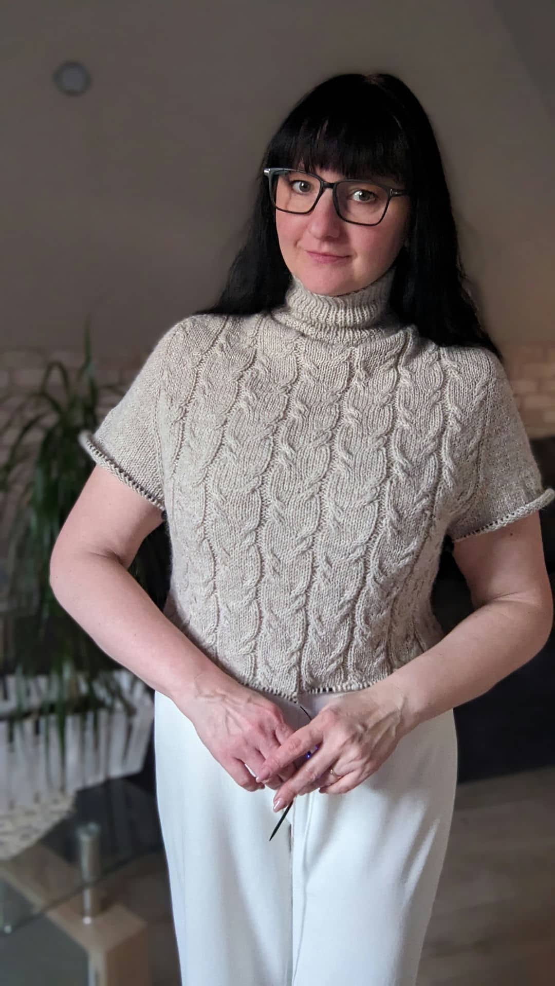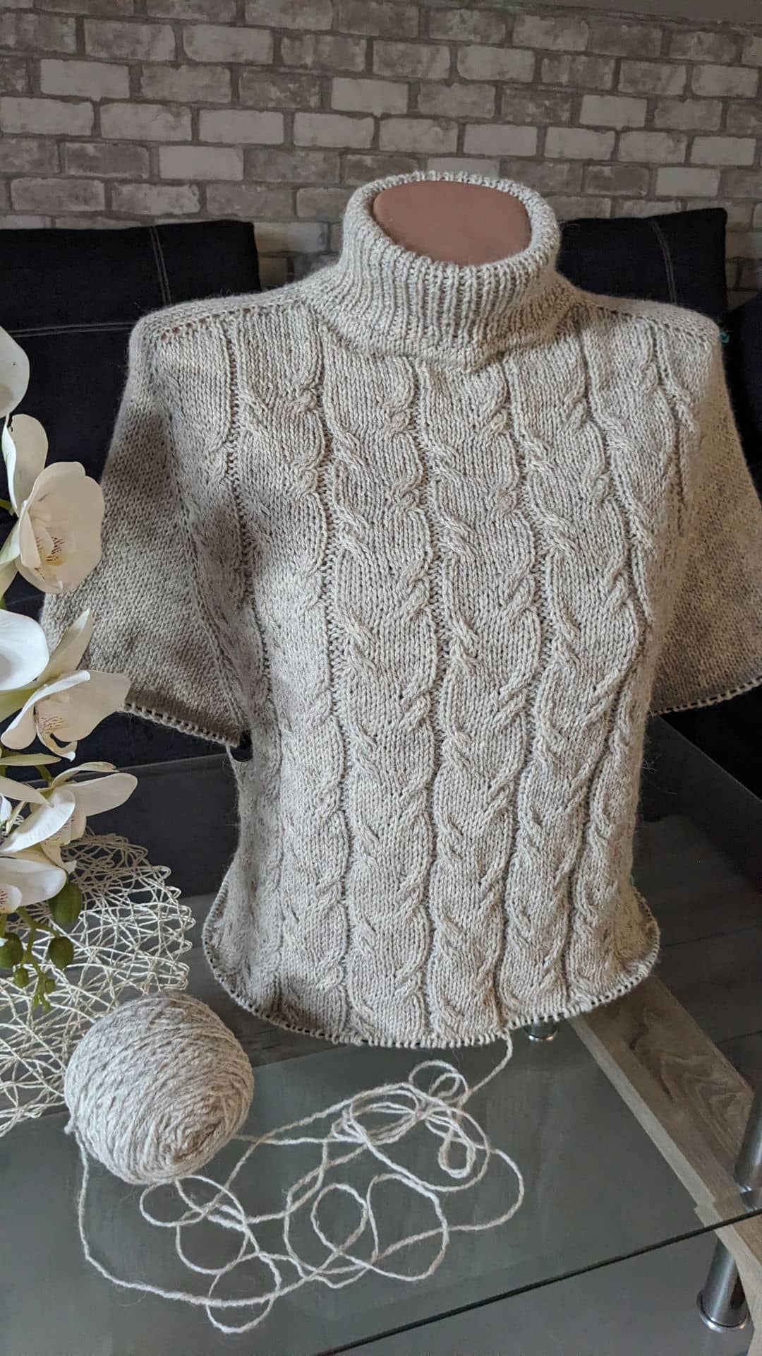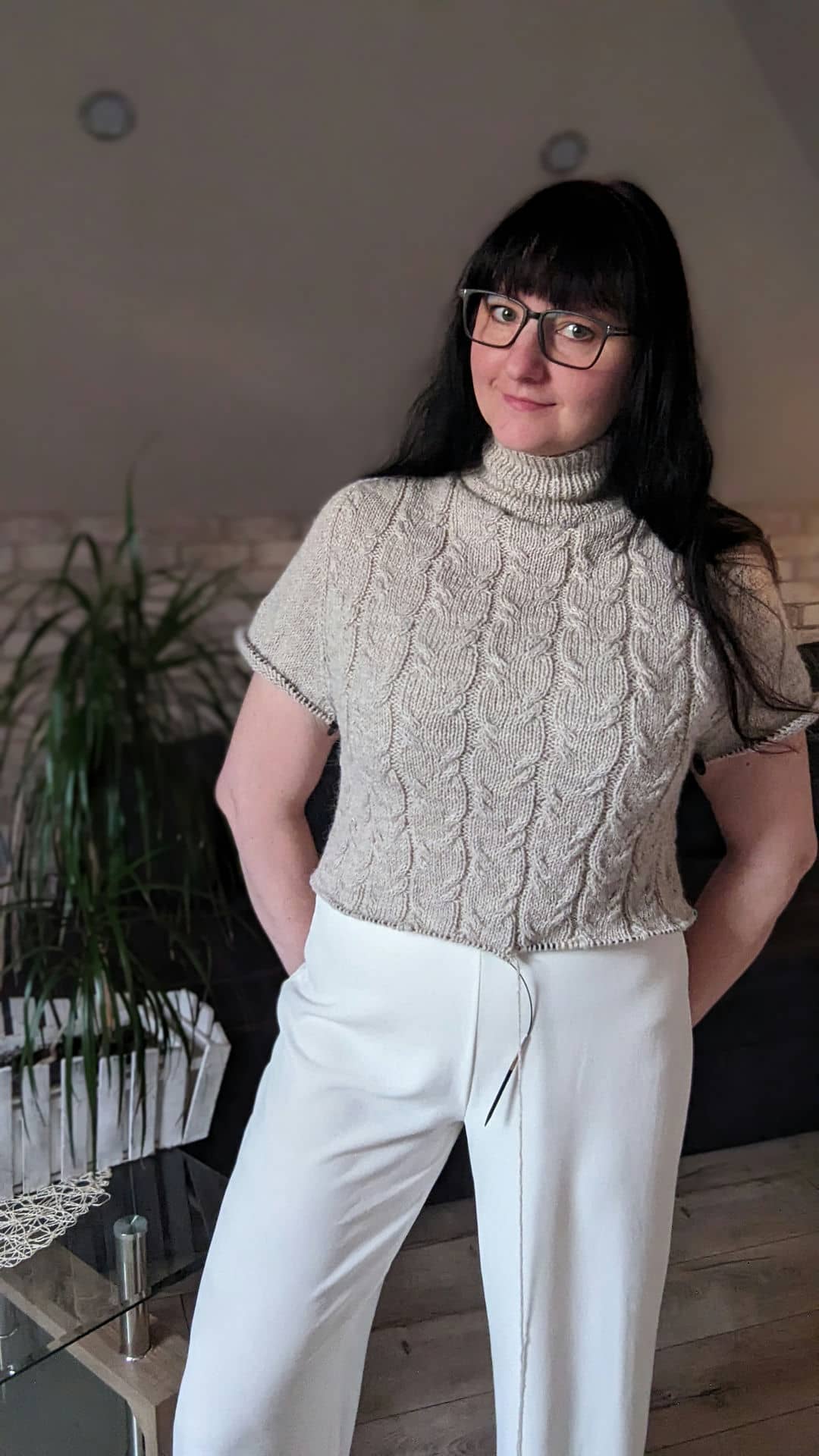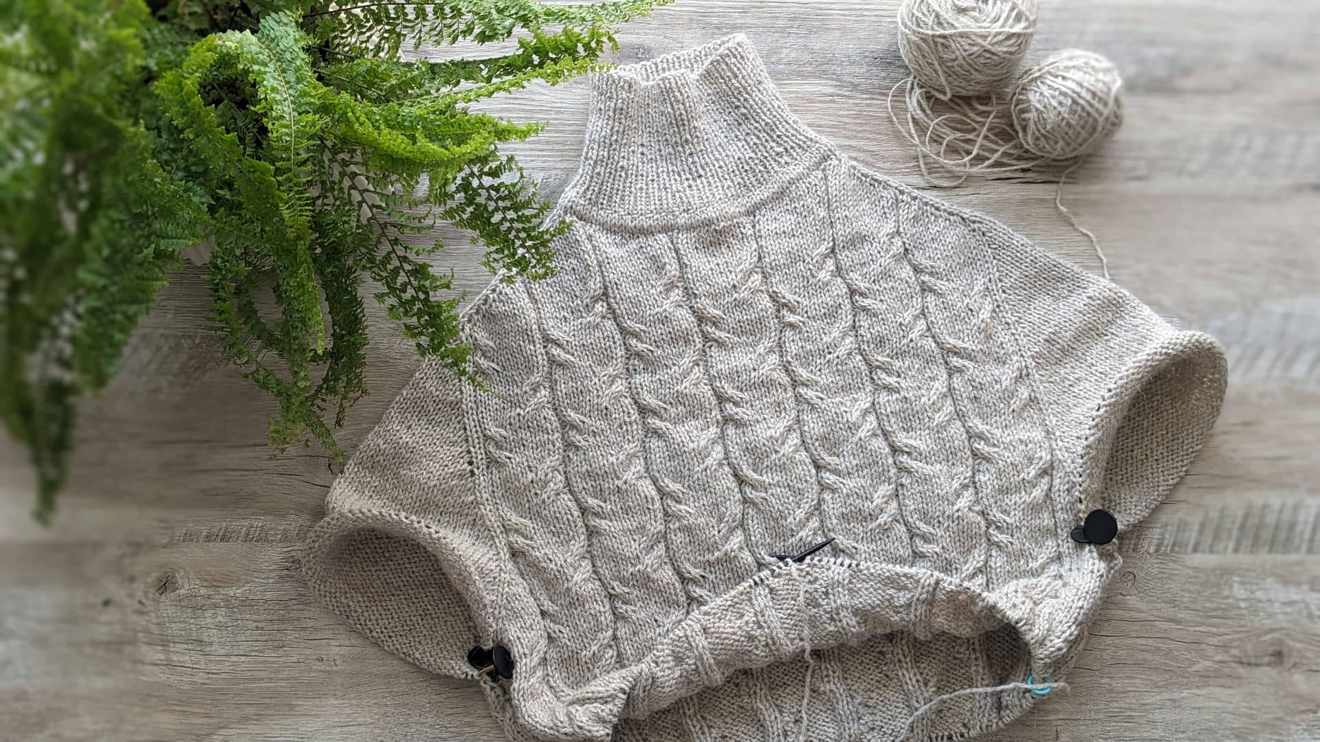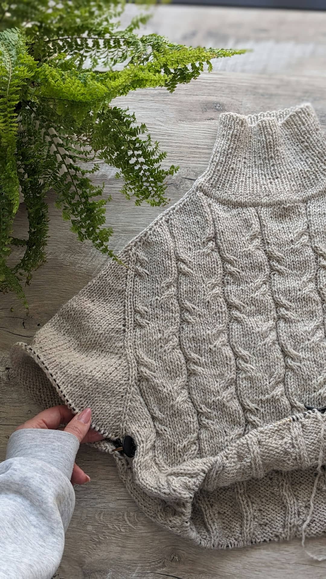 Починаємо в’язати кокетку зворотніми рядами та формувати класичний росток. Основна частина – смужки з косами, рукави – лицьова гладь.