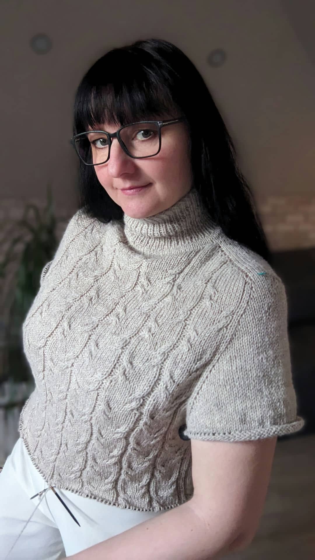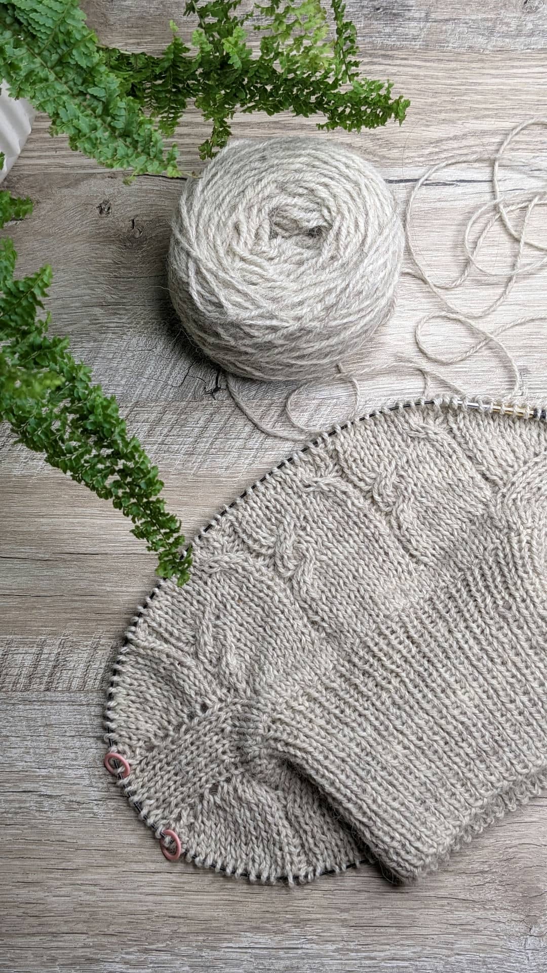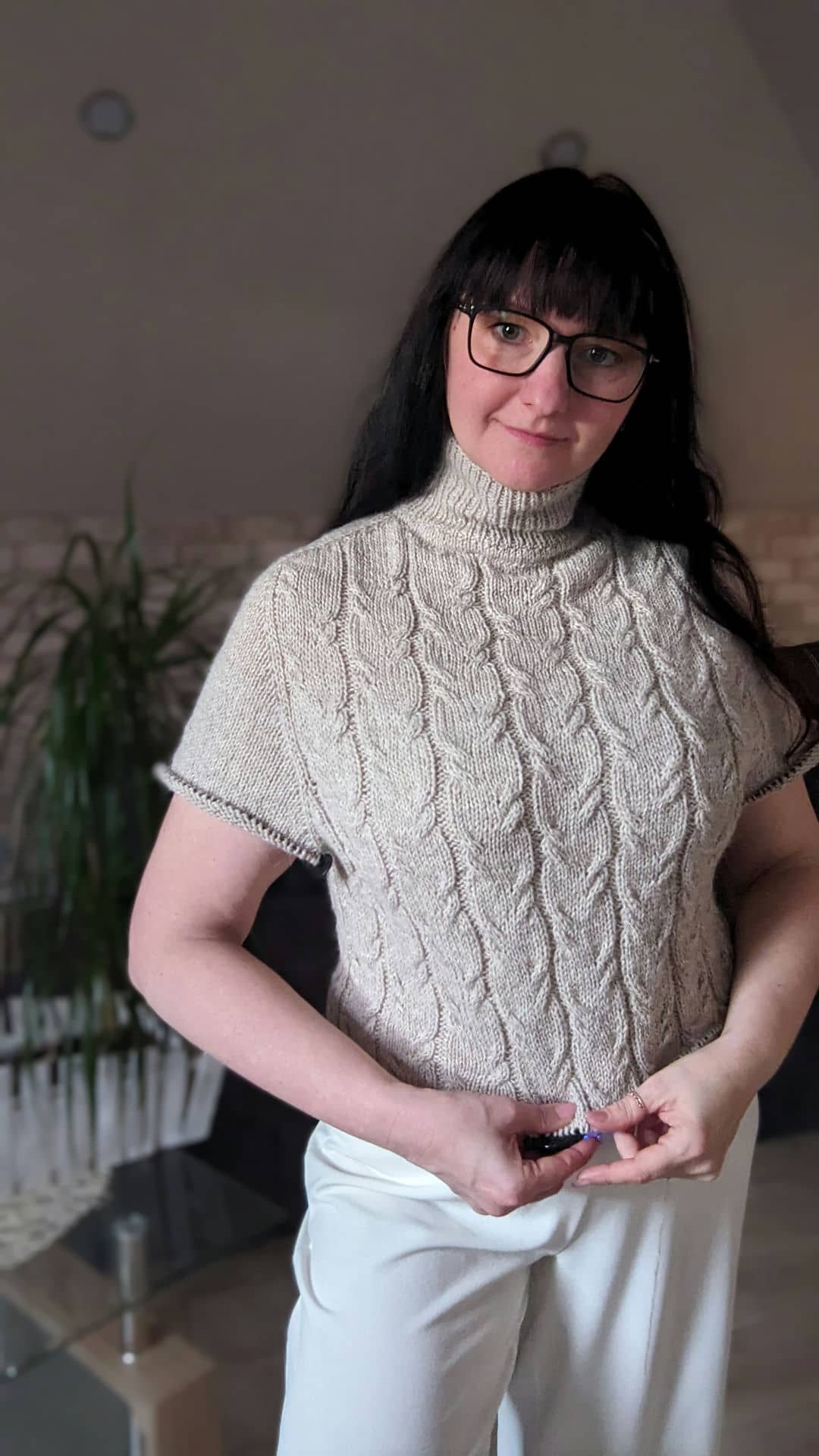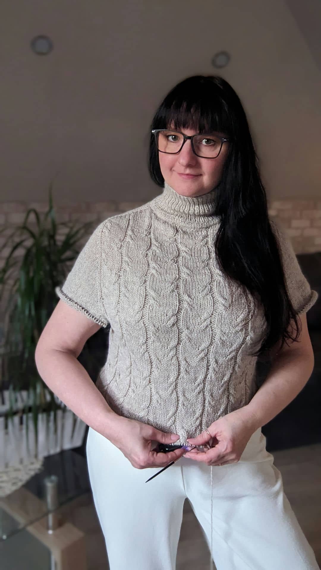 Починаємо в’язати кокетку зворотніми рядами та формувати класичний росток. Основна частина – смужки з косами, рукави – лицьова гладь.
