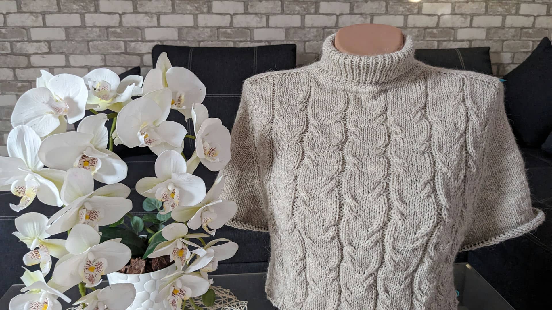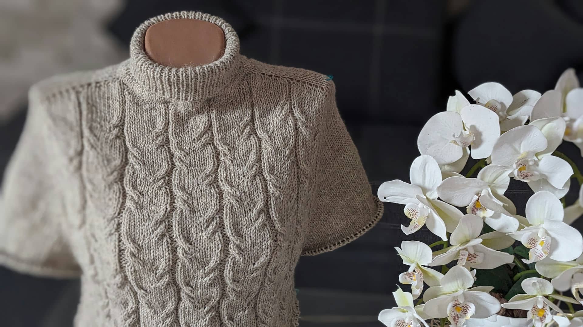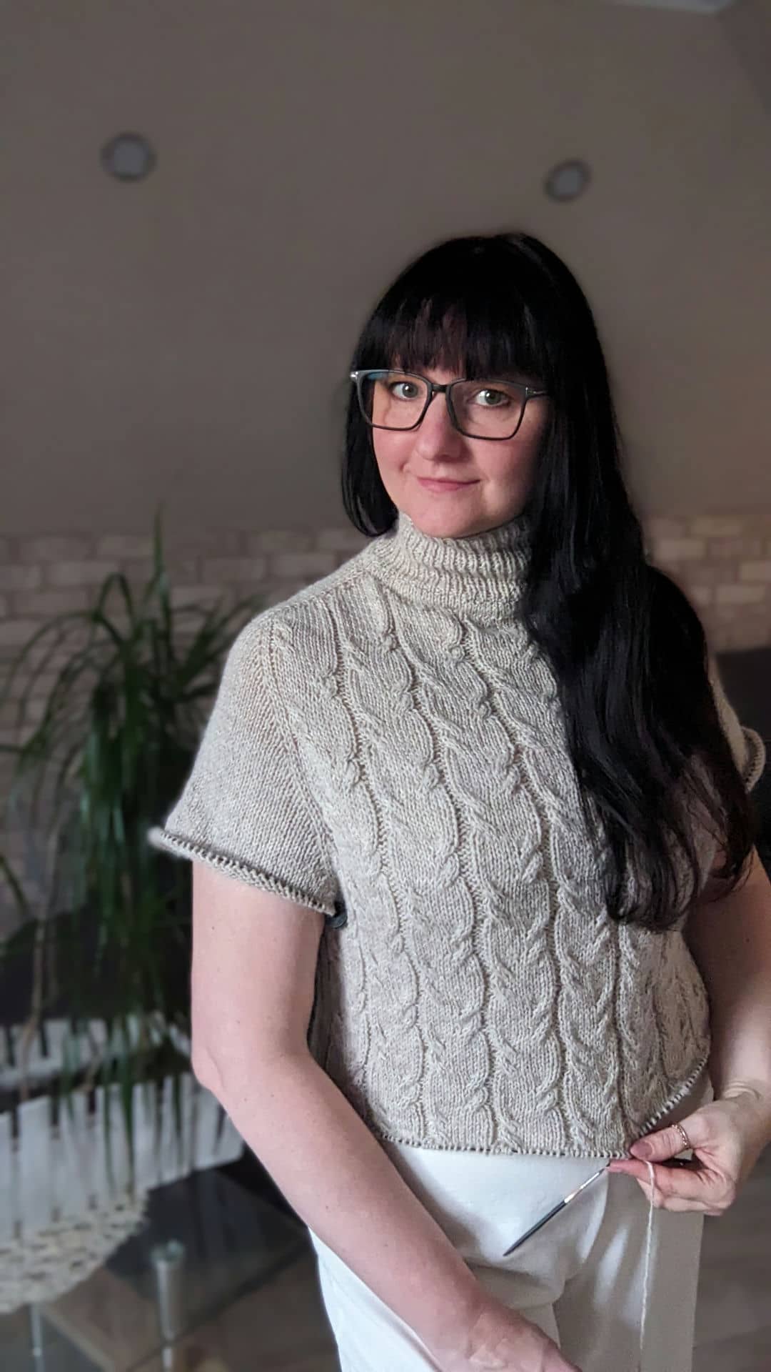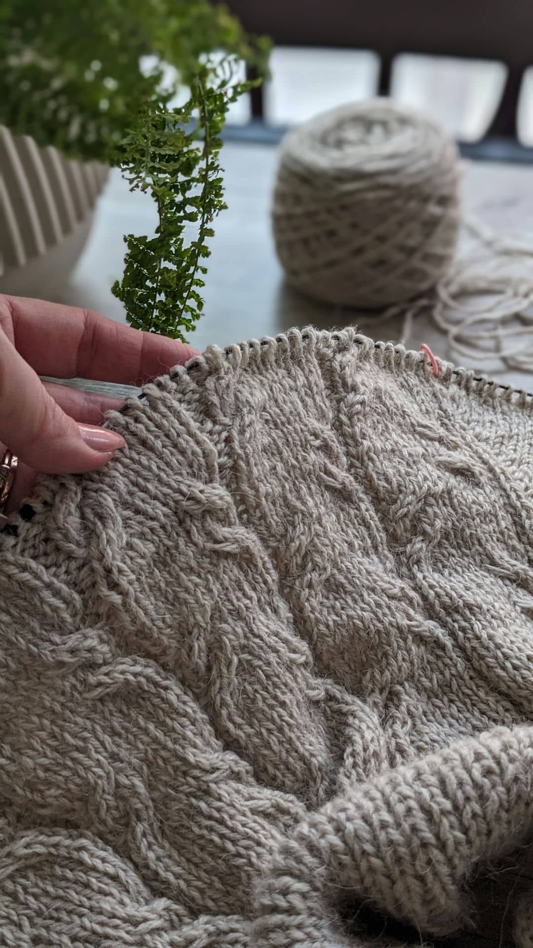 Починаємо в’язати кокетку зворотніми рядами та формувати класичний росток. Основна частина – смужки з косами, рукави – лицьова гладь.