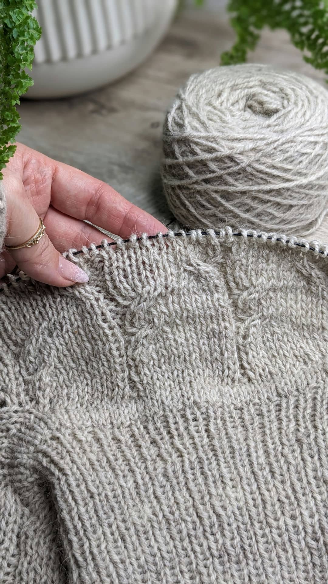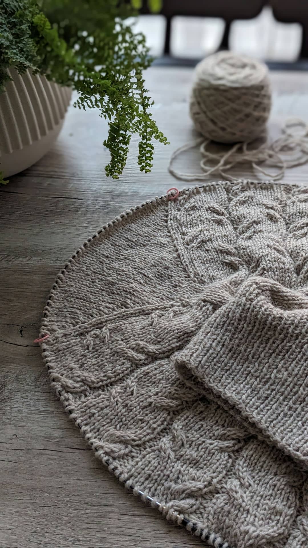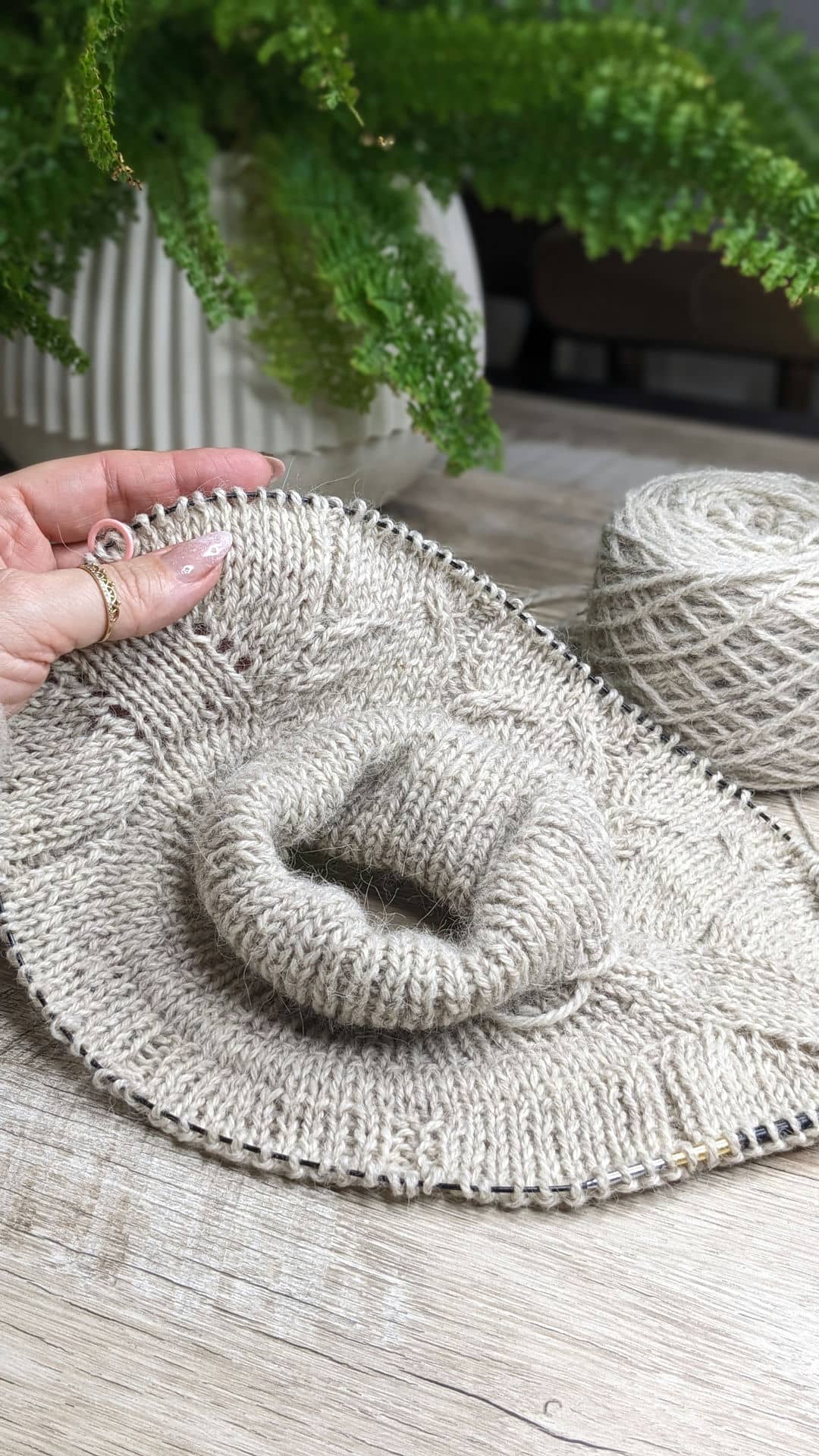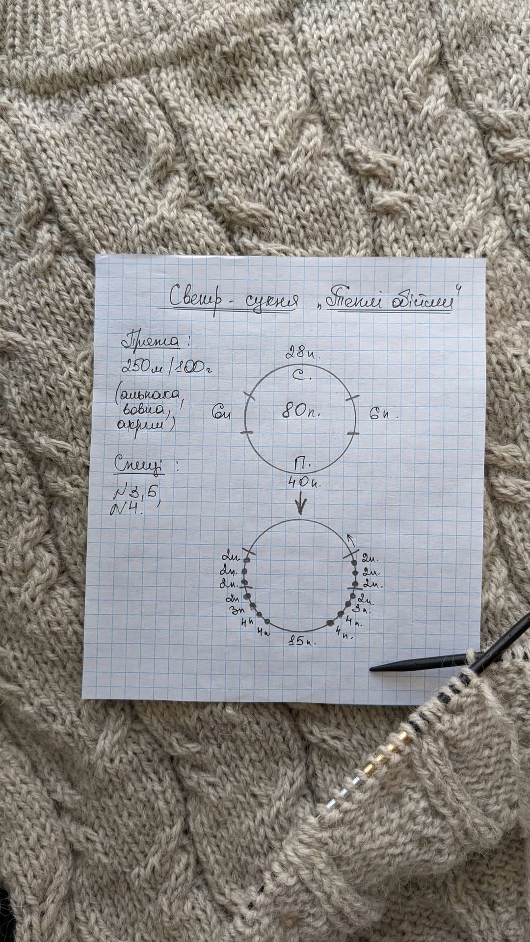 36 ряд: лицьову та виворітну пров’язуємо як дві разом лицьовою, і так по всьому круговому рядку. Кількість петель зменшиться вдвічі 160/2 = 80 петель.