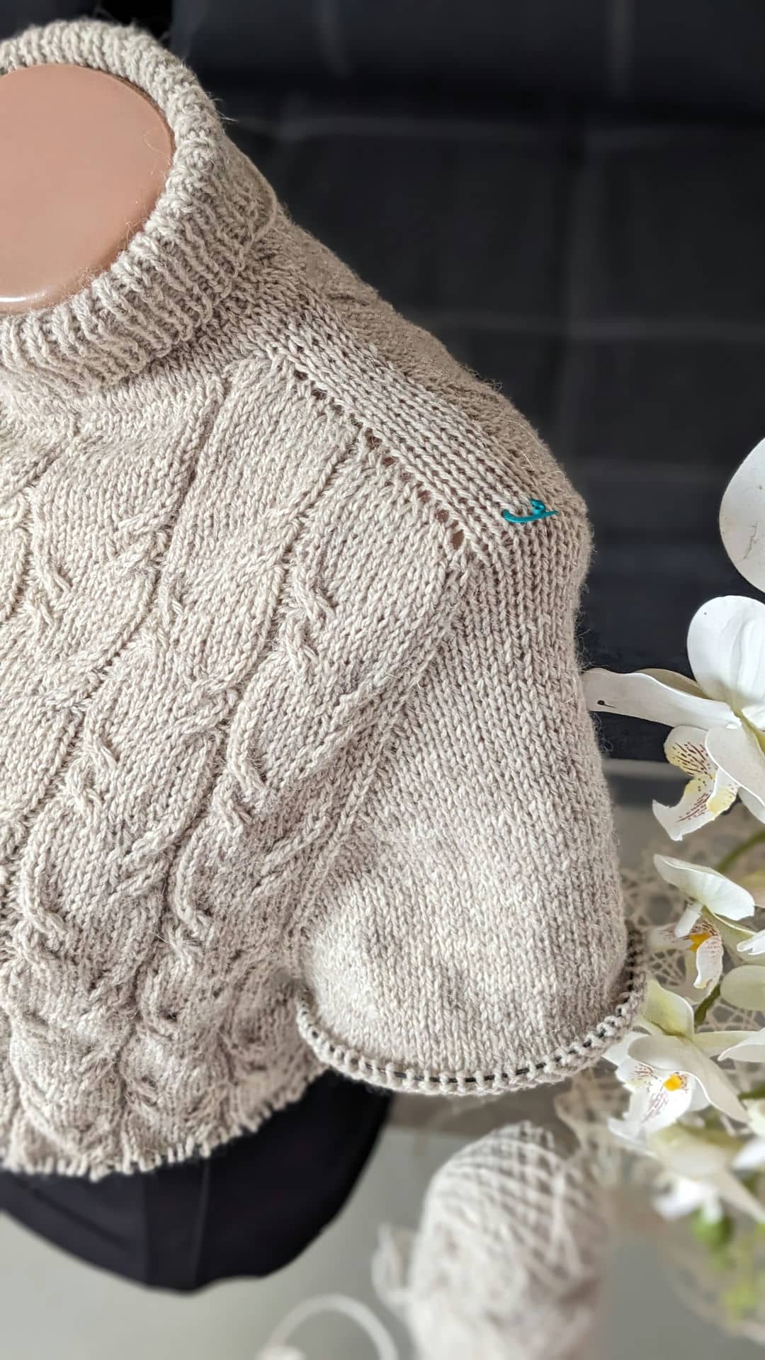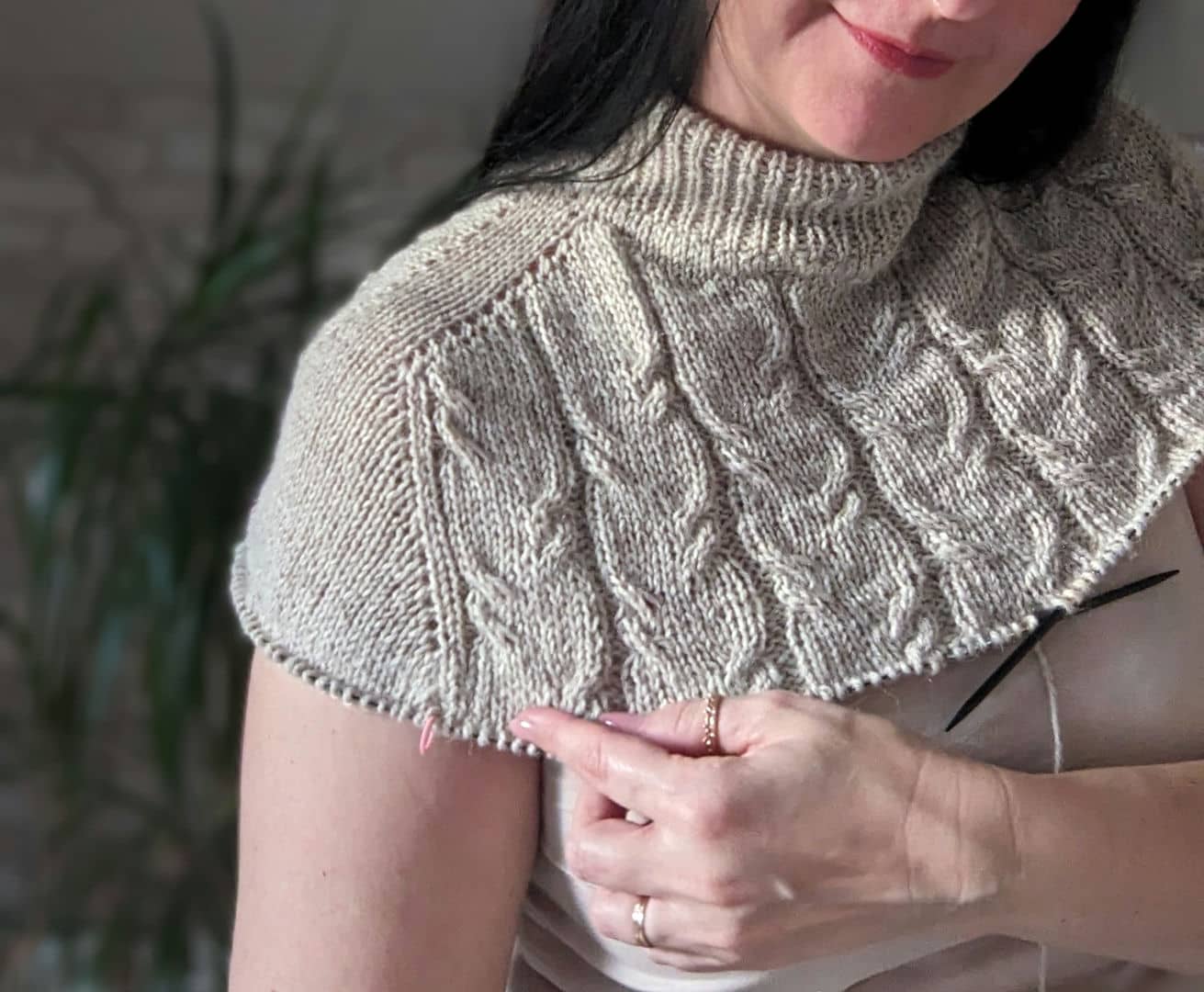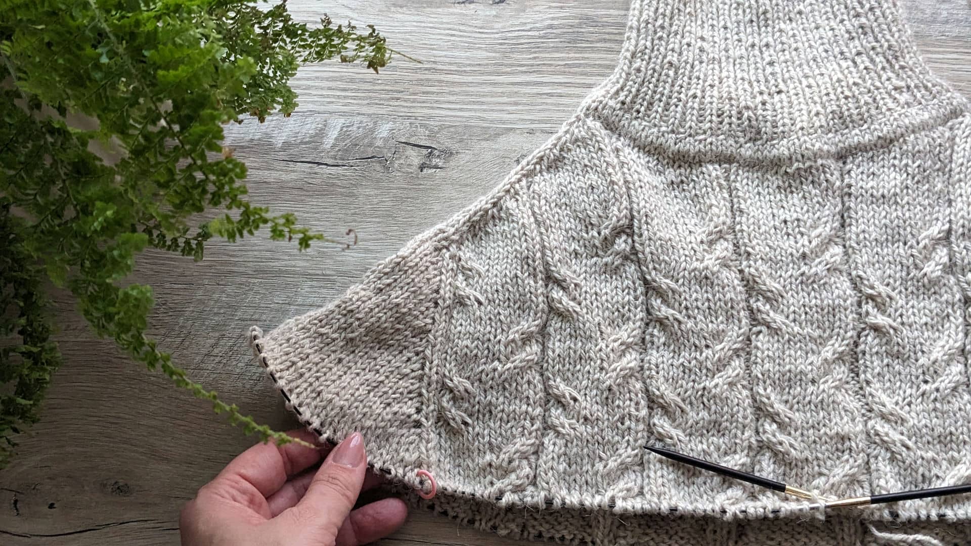 - виконуємо подвійне збільшення для переда (додаємо нову петлю з шостої петлі плеча, вводячи спицю на ряд нижче, наступну петлю додаємо у вигляді накиду),