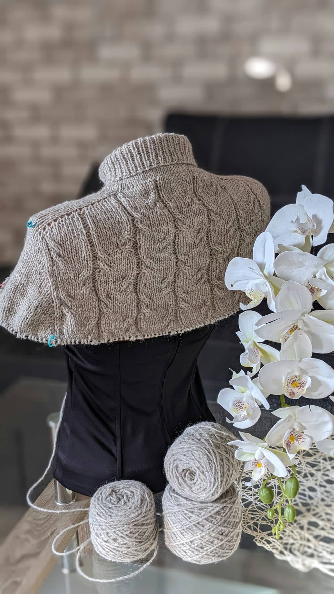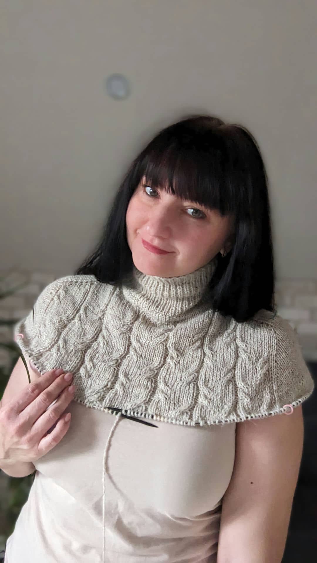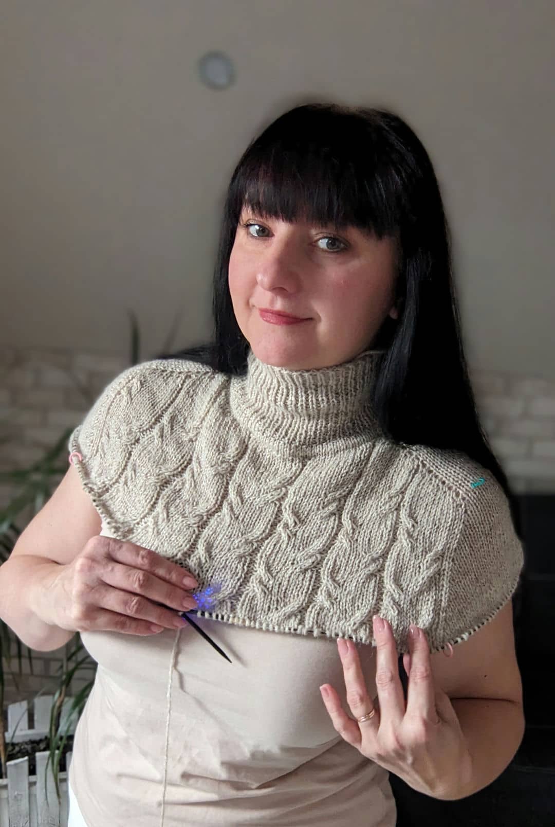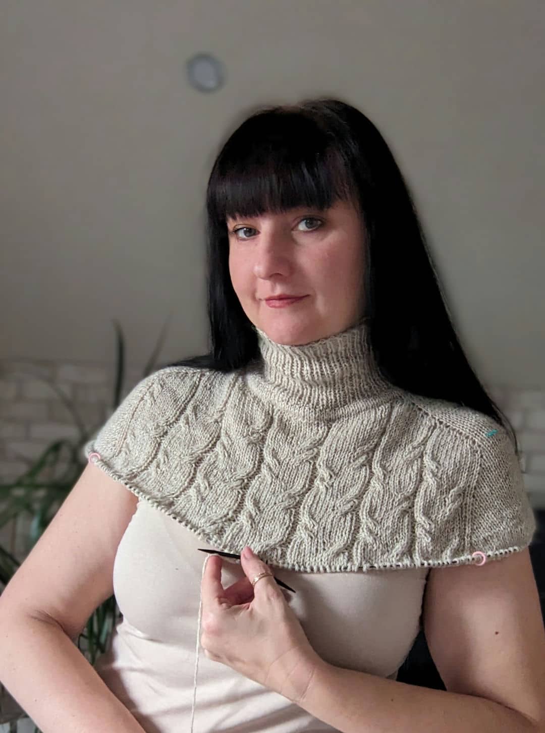 В процесі в’язання виконуємо примірки. Коли лінія погону досягла 10 см, кількість петель кокетки становить: спинка/перед – по 88 петель, плечі – по 6 петель.