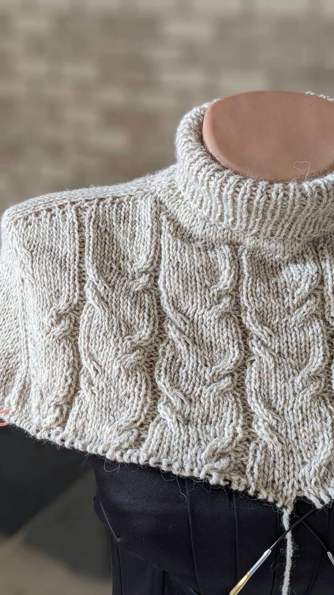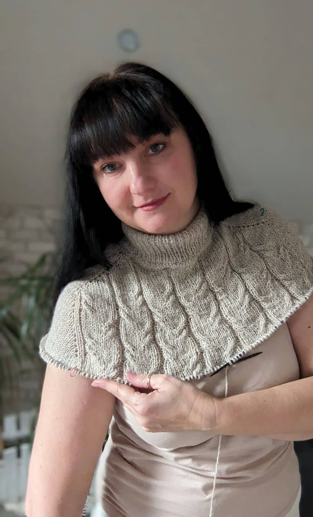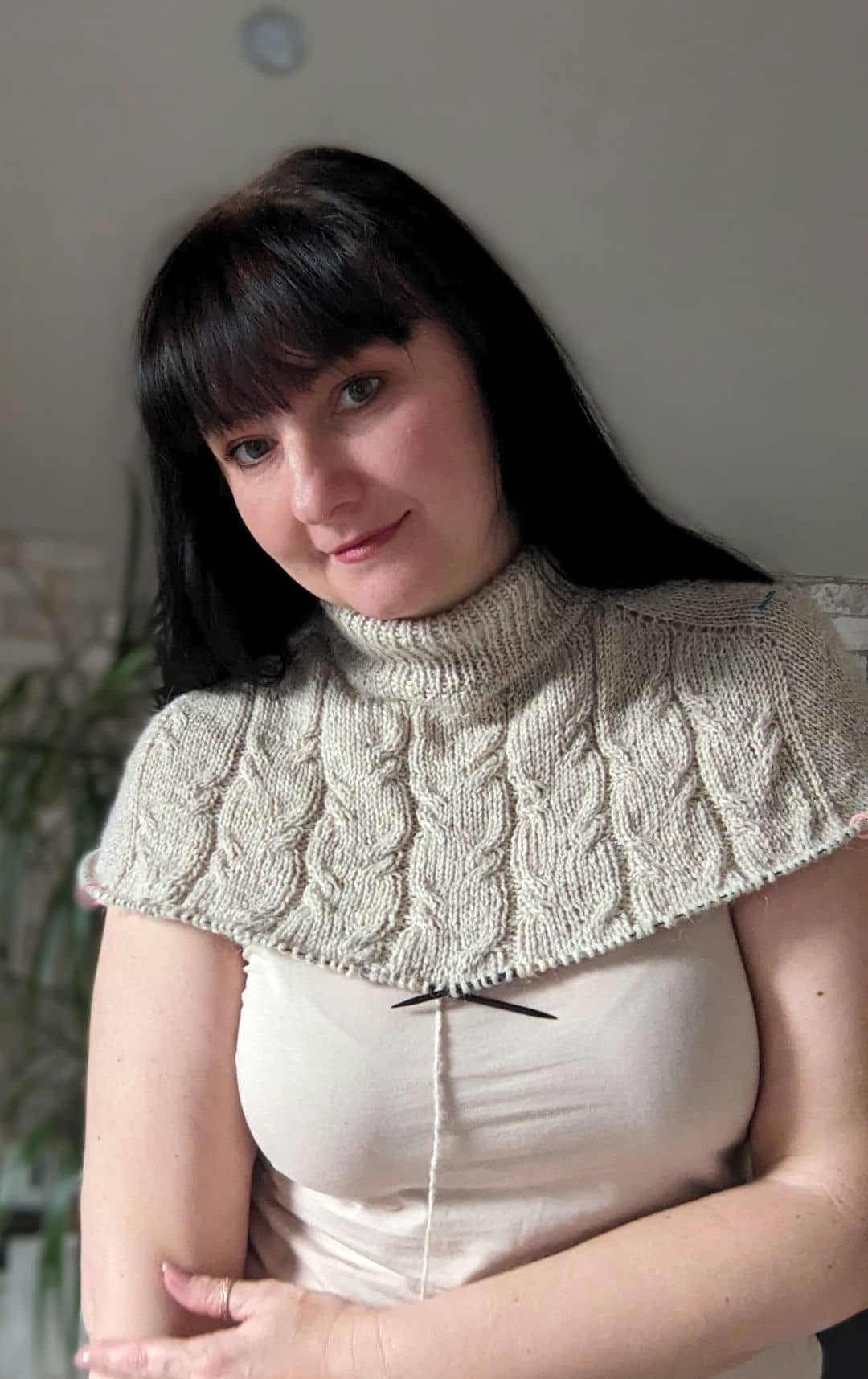 В процесі в’язання виконуємо примірки. Коли лінія погону досягла 10 см, кількість петель кокетки становить: спинка/перед – по 88 петель, плечі – по 6 петель.